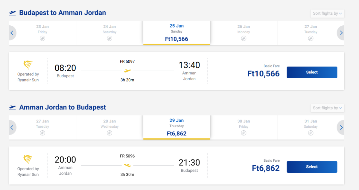A Ryanair fapados légitársaság olcsó retúrjegyeket kínál Budapestről Ammánba. A legérdekesebb a január 25-29-i dátum, ideális egy ötnapos útra, az ár 17 428 huf.