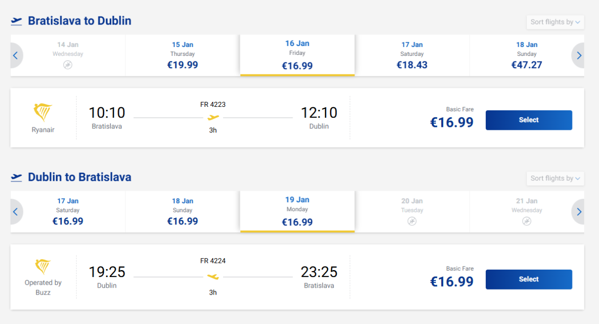 A szombat-hétfő opció 6:00-kor indul Kassáról és 19:25-kor tér vissza Dublinból.
