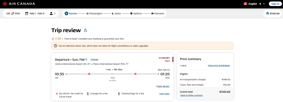 A járat egy torontói átszállással közlekedik. Az odaúton az átszállási idő 4 óra 45 perc. A visszaúton a leszállás kb. 11 óra - Torontóba reggel 7:20-kor érkezünk, és a bécsi átszállás csak 18:30-kor indul, amit ki lehet használni egy rövid városnézésre.