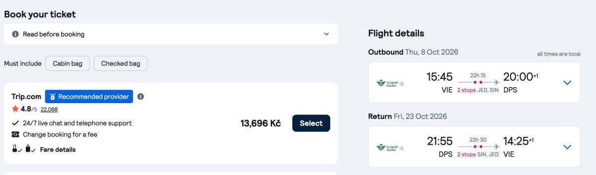 Az Istenek szigetére olcsó jegyeket vásárolhat Bécsből a Saudia Airlines légitársasággal. A 13 696 czk oldalon szeptemberben és októberben már kaphatók retúrjegyek Balira. Vásárláskor válasszon egy olyan jó hírű kereskedőt, mint a Trip.com. Vagy használja a Pelikan.cz oldalon található naptárat.