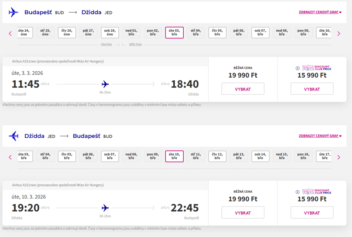 A Wizz Air 39 980 huf-ért, illetve WDC-tagok számára 31 980 huf-ért kínál retúrjegyeket Budapestről Dzsiddába.