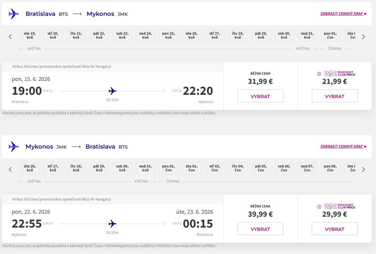 A Wizz Air segítségével olcsó járatokat találhat Pozsonyból a görögországi Mykonos szigetére. A retúrjegyek 64 eurótól, WDC tagok 44 eurótól vásárolhatók meg.