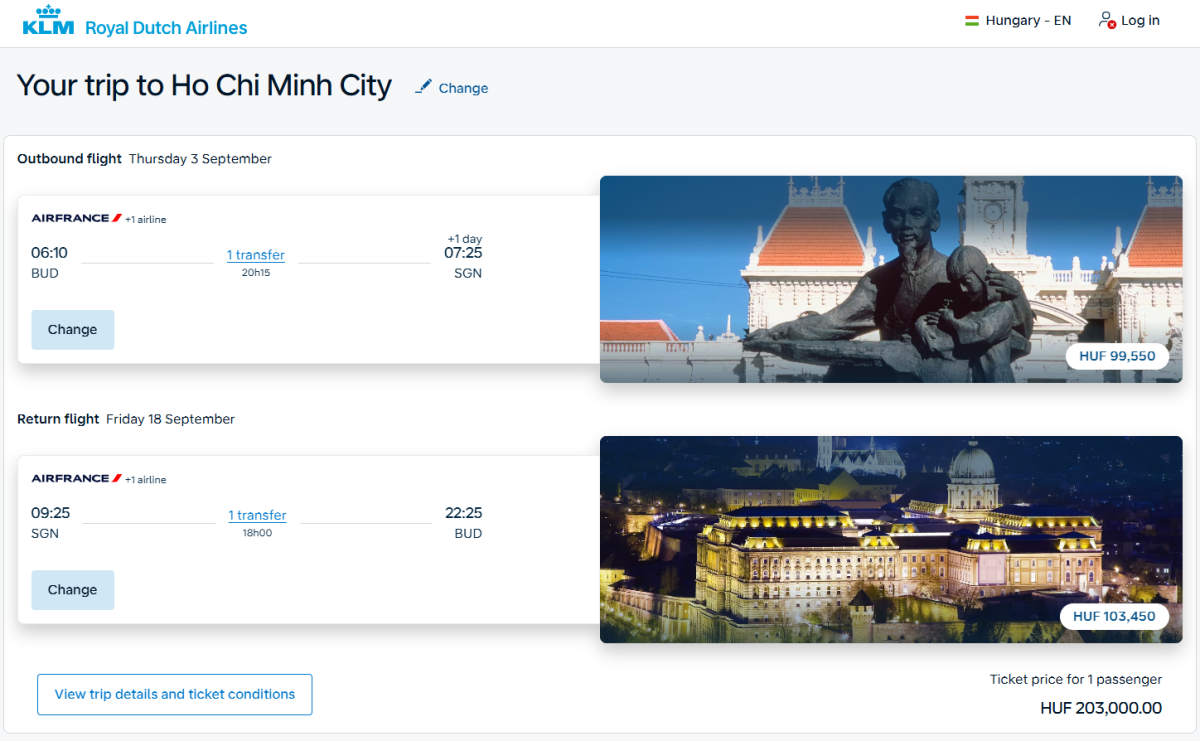 Air France repülőjegyek Budapestről Ho Si Minh-városba 203 000 huf-ért oda-vissza járatra. Az elérhető időpontok májustól július elejéig, majd augusztustól október elejéig tartanak.