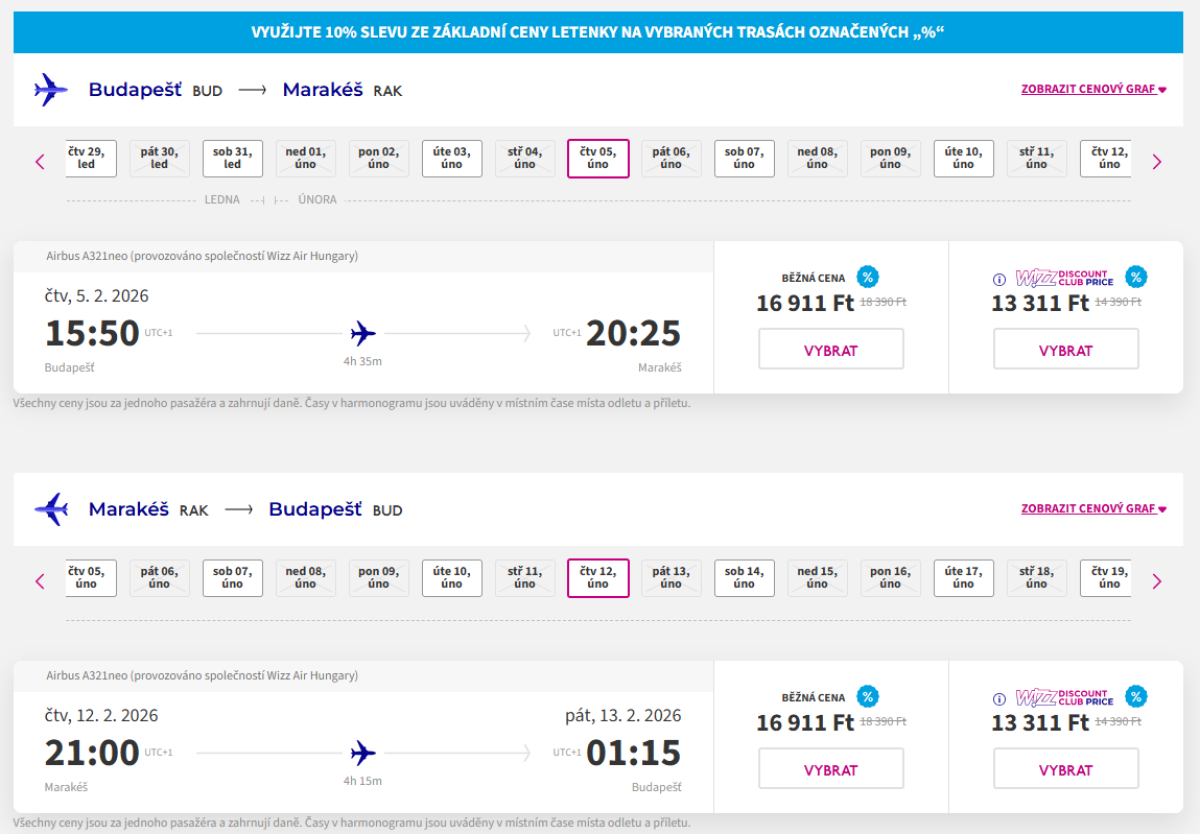 A járatok keddenként, csütörtökönként és szombatonként indulnak, így könnyen tervezhetünk egyhetes nyaralást vagy rövidebb marokkói kirándulást. Ebben az időszakban rengeteg időpont áll rendelkezésre.