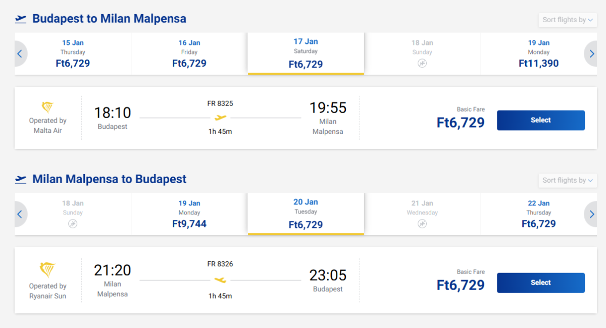 A Ryanair aktuális ajánlata kedvező árú retúrjegyeket kínál Budapestről, a legalacsonyabb árak különösen januárban és februárban érhetőek el. Vannak hosszú hétvégére is alkalmas időpontok.