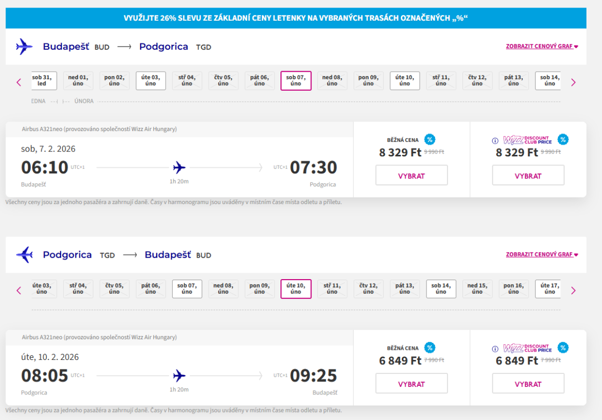 Az indulás Budapestről szombaton 6:10-kor, a visszautazás Podgoricából kedden 8:05-kor.