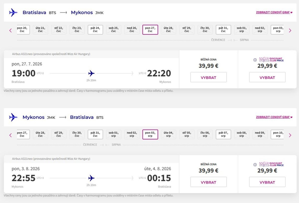 A Wizz Air fapados légitársaság olcsó járatokat kínál Pozsonyból a görögországi Mykonos szigetére a nyári szünetben. A menettérti járatok ára 80 eurót, WDC-tagok számára 60 eurót kóstál.