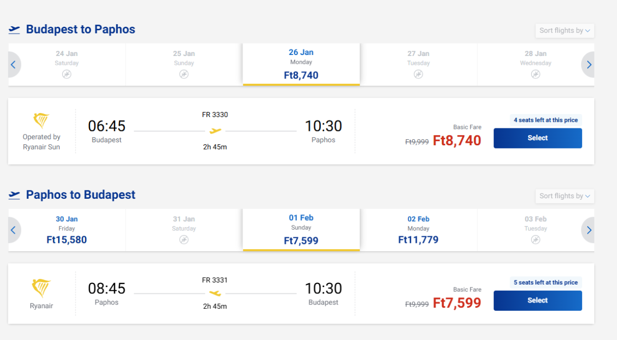 A Ryanair fapados légitársaság a téli időszakban kedvező áron kínál oda-vissza járatokat Budapestről Páfoszra. A legolcsóbb időpontok főként februárban vannak, de januárban vagy március elején is előfordulnak jó, 24 000 huf körüli árak.