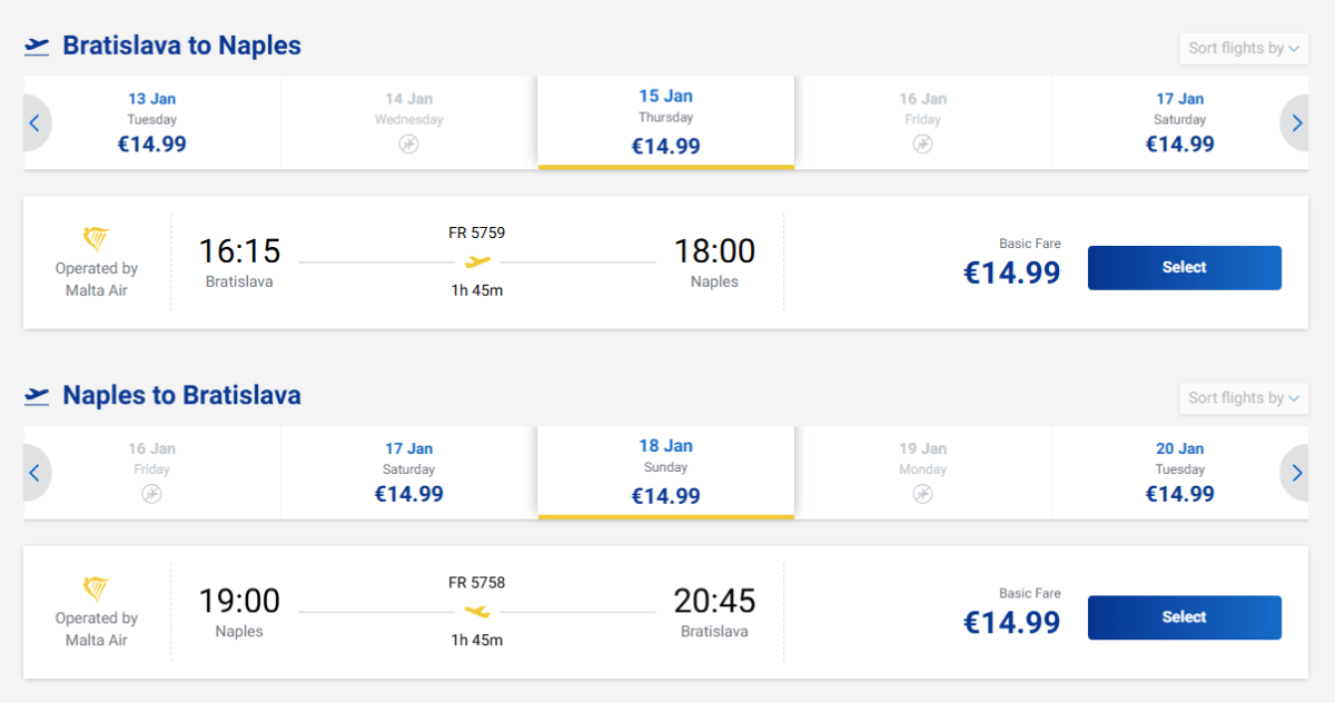 A Ryanair fapados légitársaság jelenleg 30 eurós áron kínál olcsó retúrjegyeket Pozsonyból Nápolyba. Az időpontok egész januárban elérhetőek, és a járatok rendszeresen keddenként, csütörtökönként, szombatonként és vasárnaponként közlekednek.