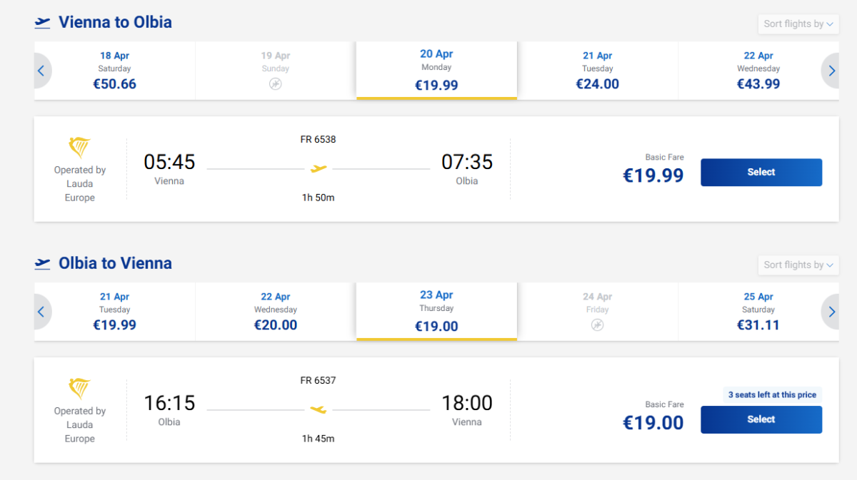 Tavasszal a Ryanair szezonális járatai Bécsből Olbiába nagyszerű ajánlatokat kínálnak a szardíniai járatokra. Áprilisban már 39 eurótól lehet retúrjegyet vásárolni.