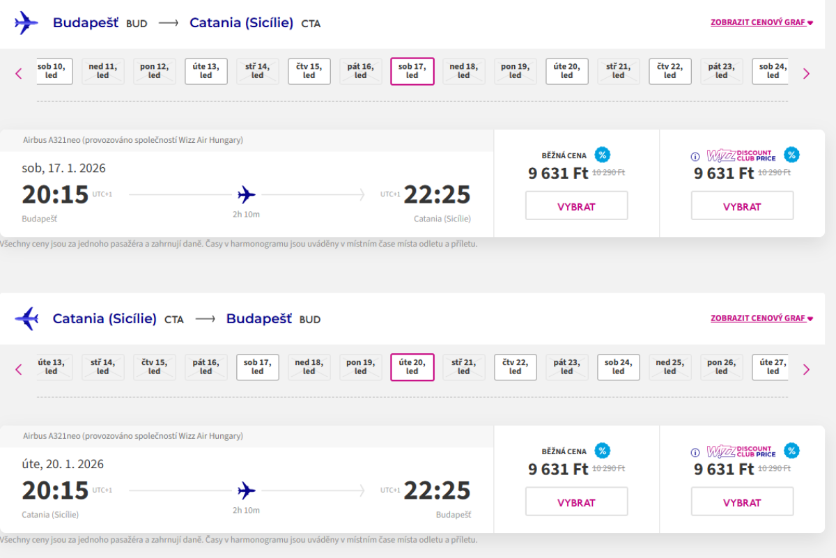 Az indulás Budapestről 20:15-kor van, és a Cataniából induló visszaút szintén 20:15-kor indul.