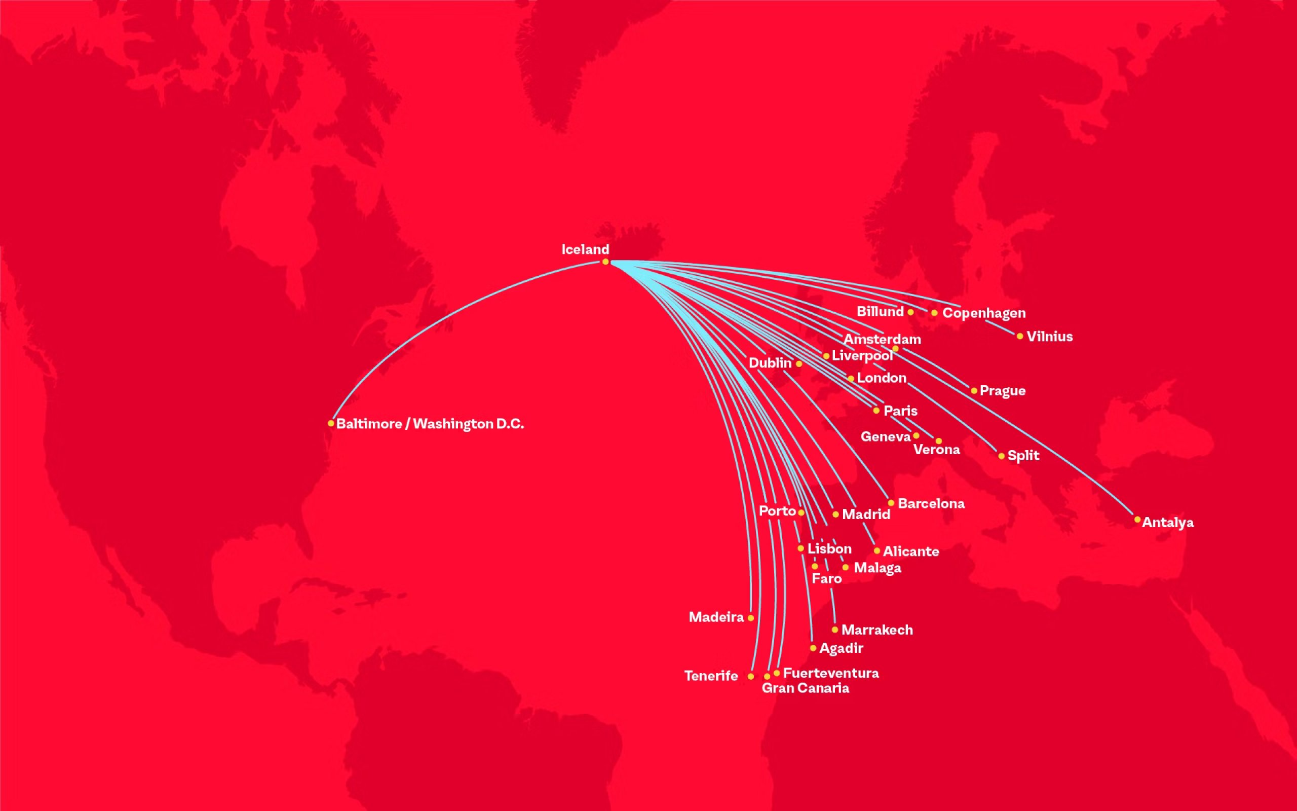 Az Észak-Amerikába irányuló járatokat fokozatosan megszüntették, és az izlandiak tengerparti nyaralóhelyekre történő szállítására, valamint az ellenkező potenciállal rendelkező útvonalakra - a turisták Izlandra hozására - összpontosítottak. Népszerűek voltak például a Prága PRG, Varsó WAW, London STN, Vilnius VNO vagy Párizs CDG útvonalak.