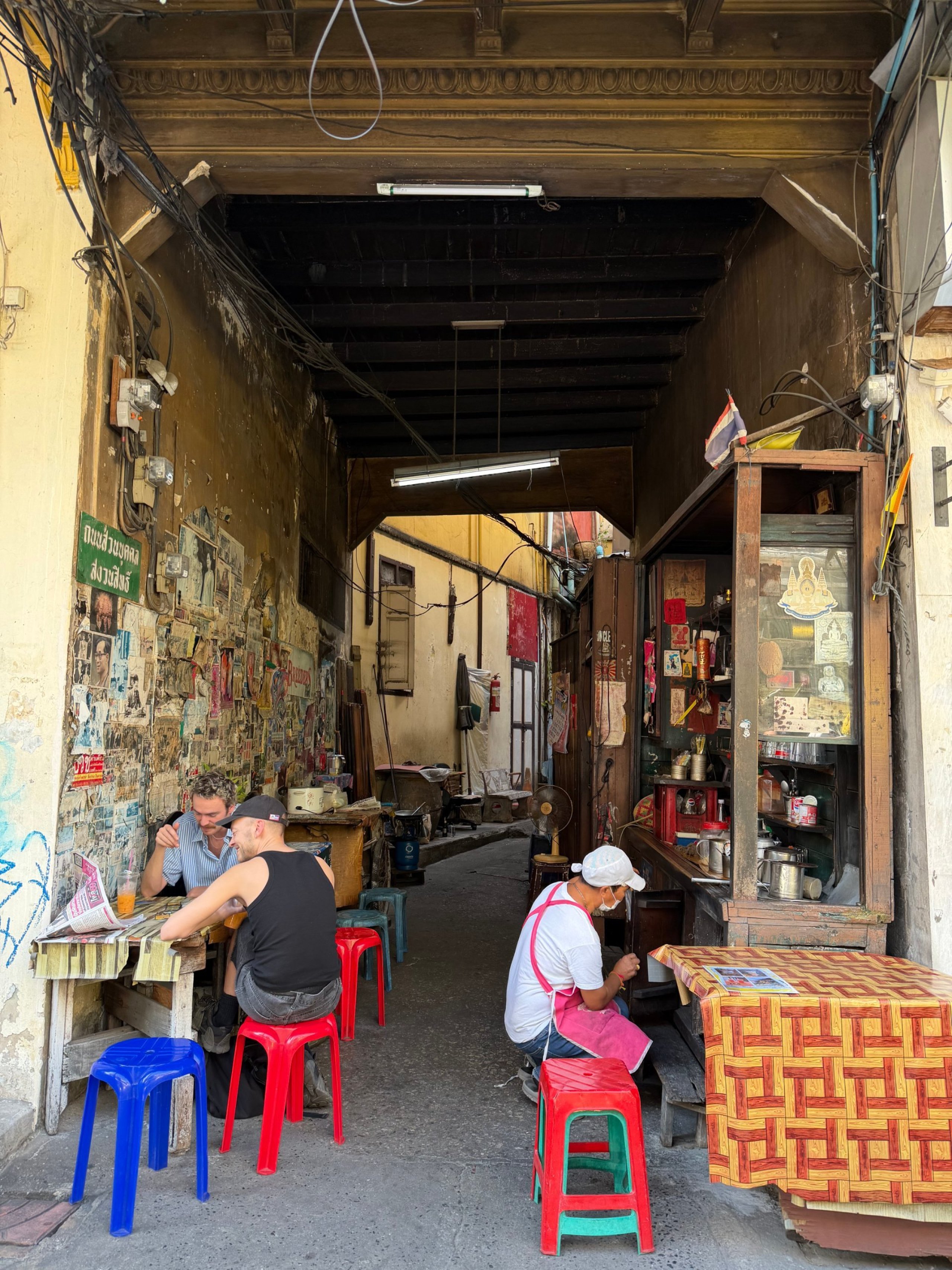 A bisztrónak van egy utcára néző ablaka és egy kis helyiség, ahol le lehet ülni. Ott éppen nagy volt a nyüzsgés, így a mangó ragadós rizst és a hagyományos thai pudingot a szomszédos járdán ettük meg.