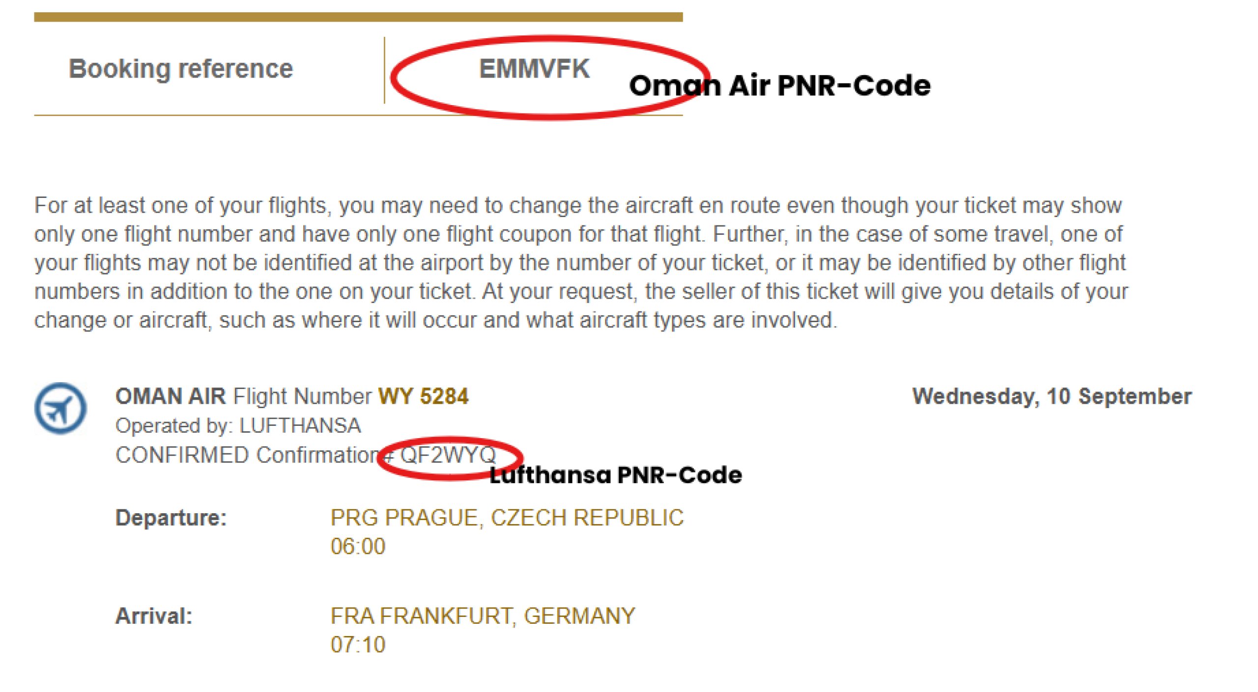 Az összes járatot egy foglalásként vásároltam meg, mégis a Lufthansa járatának Prágából Frankfurtba tartó járata más PNR-kóddal rendelkezett, mint az Oman Air járata, amely Frankfurt FRA-tól Muscat MCT-n keresztül Zanzibárba ZNZ-re tartott.