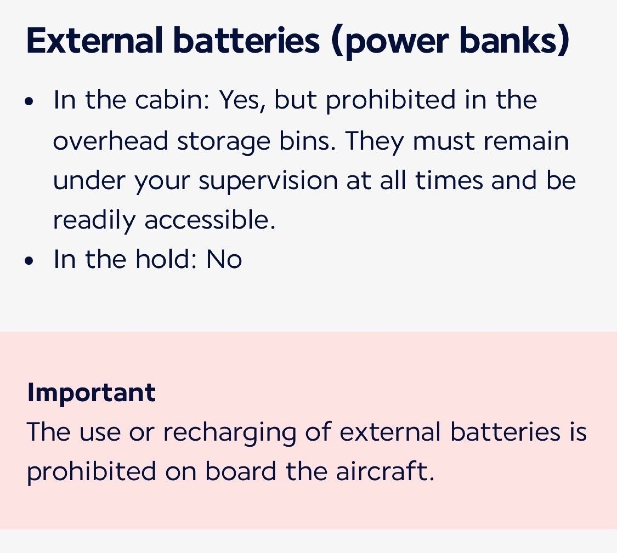 Meg kell felelniük egy maximális kapacitásnak (általában legfeljebb 100 Wh), és egyes légitársaságok megtiltják a power bankok használatát a repülés során.