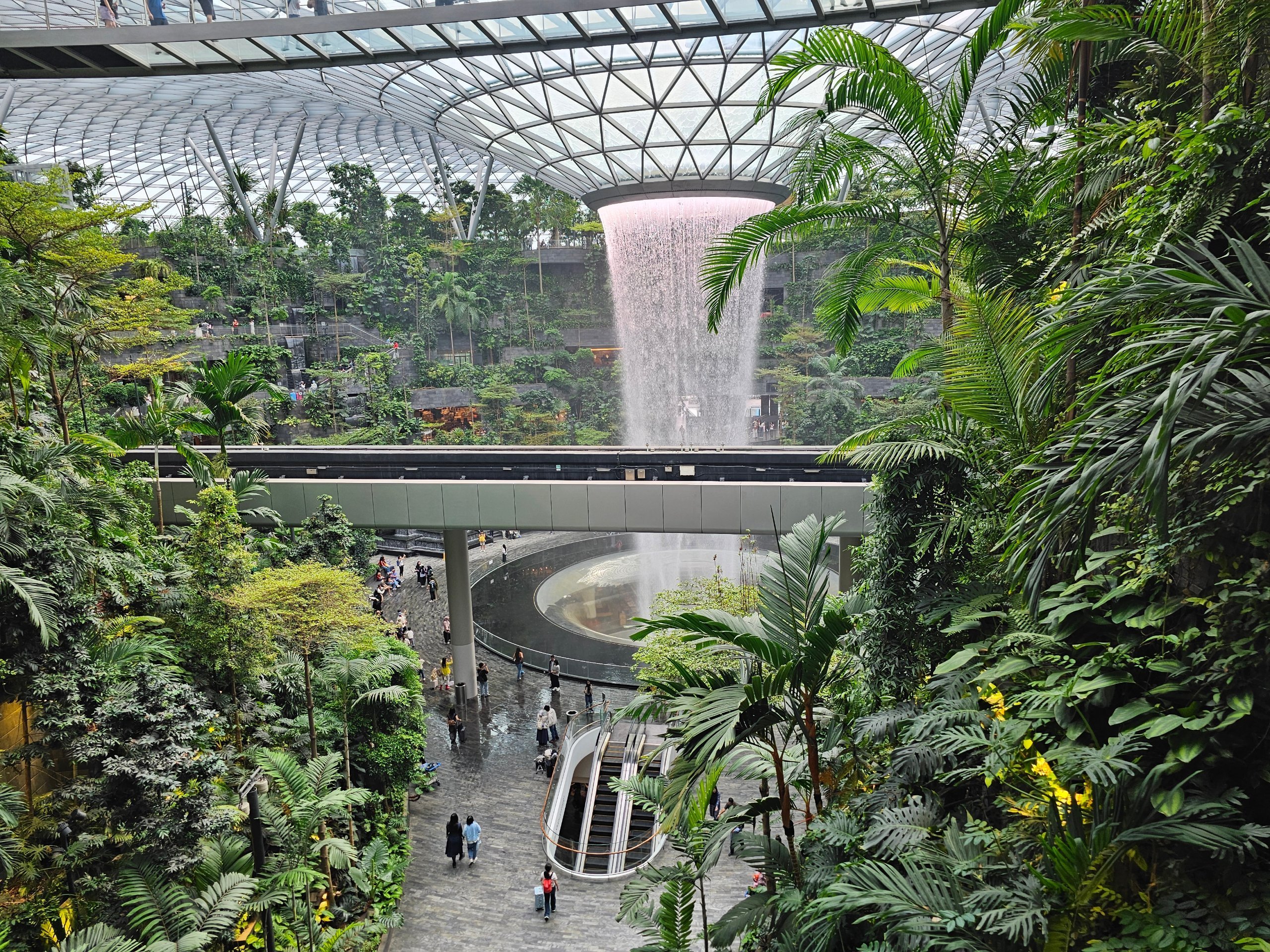 - Jewel Changi Airport - egy üzleti központ hatalmas tetőtéri vízeséssel, dzsungellel és több emeletes üzletekkel és éttermekkel.