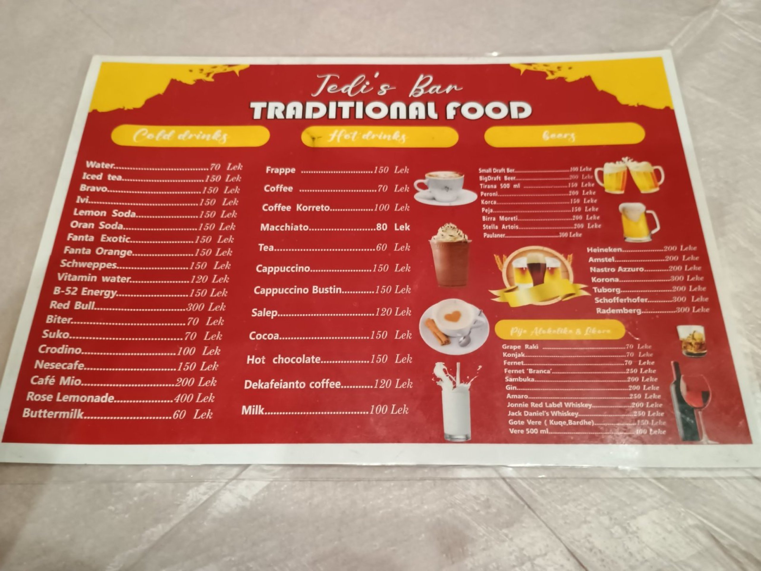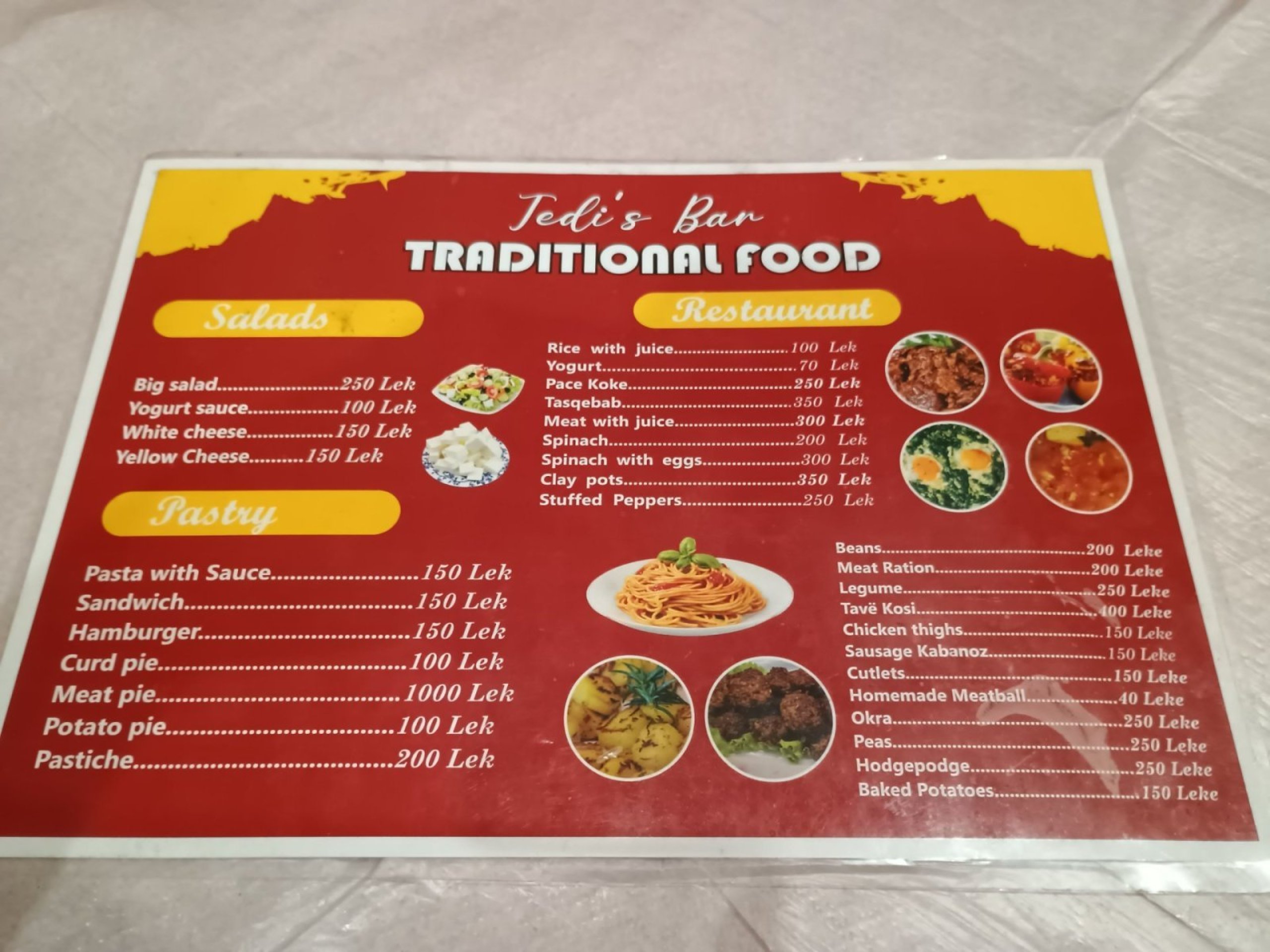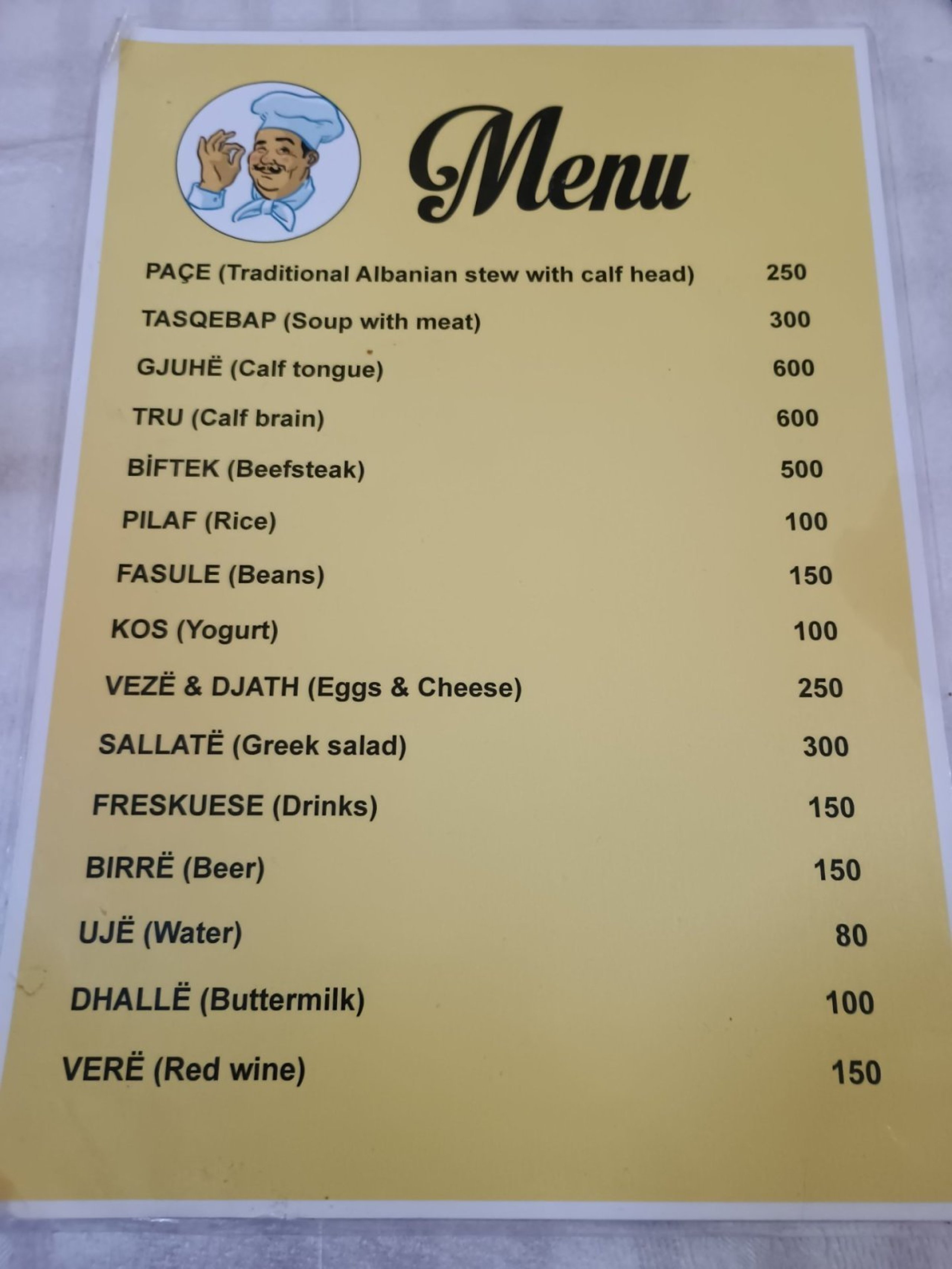 Mellékeltem egy rendes albán, nem turista étterem étlapját a dračai buszpályaudvar és a tiranai piac közelében - elég nagy a különbség a turista helyeken lévő éttermek áraihoz képest.