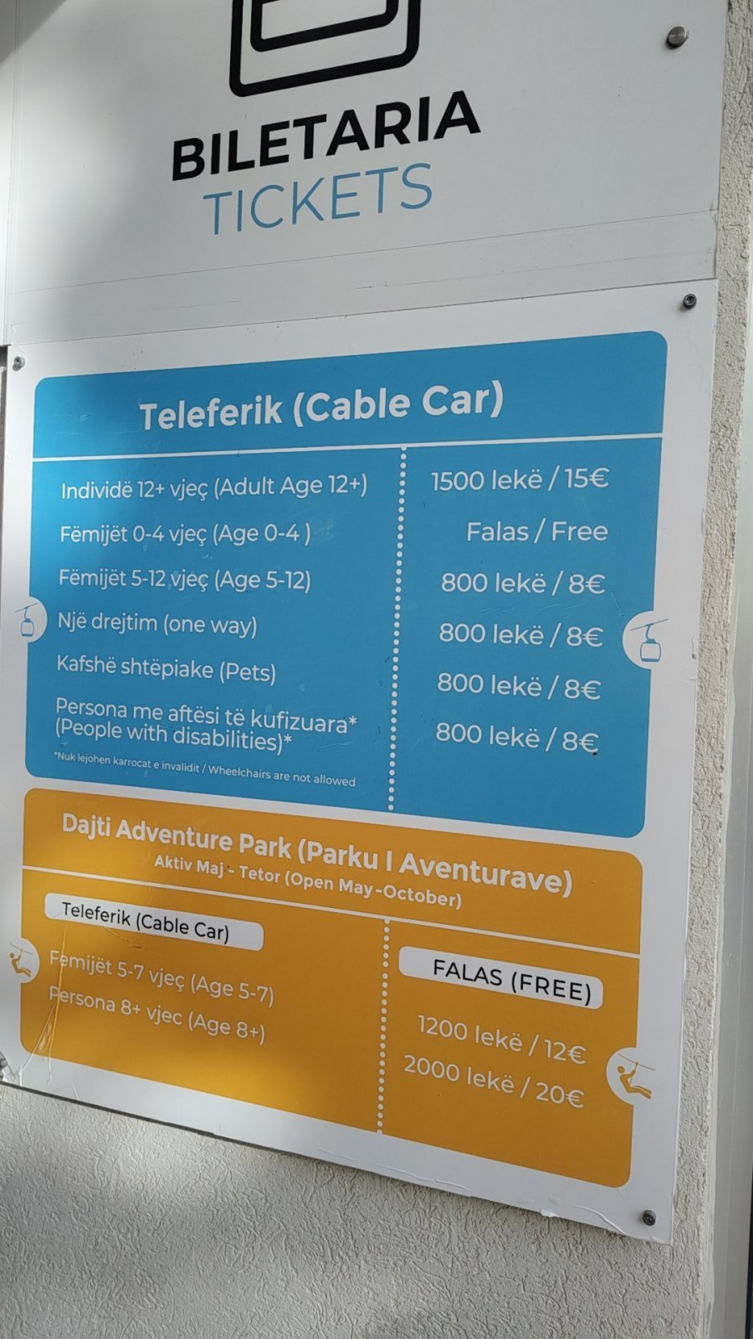 Csak hogy tisztázzuk 2025 novemberétől - a retúrjegy ára 1500 lek, tehát körülbelül 385 CZK. A drótkötélpálya azt mondja, hogy az út 15 perc, a valóságban kb. 19 perc - ez egy nagyon hosszú út, és ha szép az idő, a kilátás is szép. Érdemes reggel menni, akkor kevésbé zsúfolt. A jelzett nyilvános busz a Bunk'Art 1 bejárata alatt áll meg (ha először a bunkerhez mész, mint mi, kérdezd meg a jegyszedőt, és meg fog állni közvetlenül a bejáratnál). A bunkertől aztán a drótkötélpályához a járdán kell lemenni, majd kb. 250 méter után jobbra felfelé fordulni, majd kb. 300 métert menni tovább ( táblákkal van jelölve). A kötélpálya állomás felé menet egy kis sarki boltba botlunk, ahol hűtött italokat stb. lehet vásárolni. Az ára 1,5 liter valami barackos (Fanta-hoz hasonló) valaminek, azt hiszem 140 Lek, kb. 35 CZK volt.