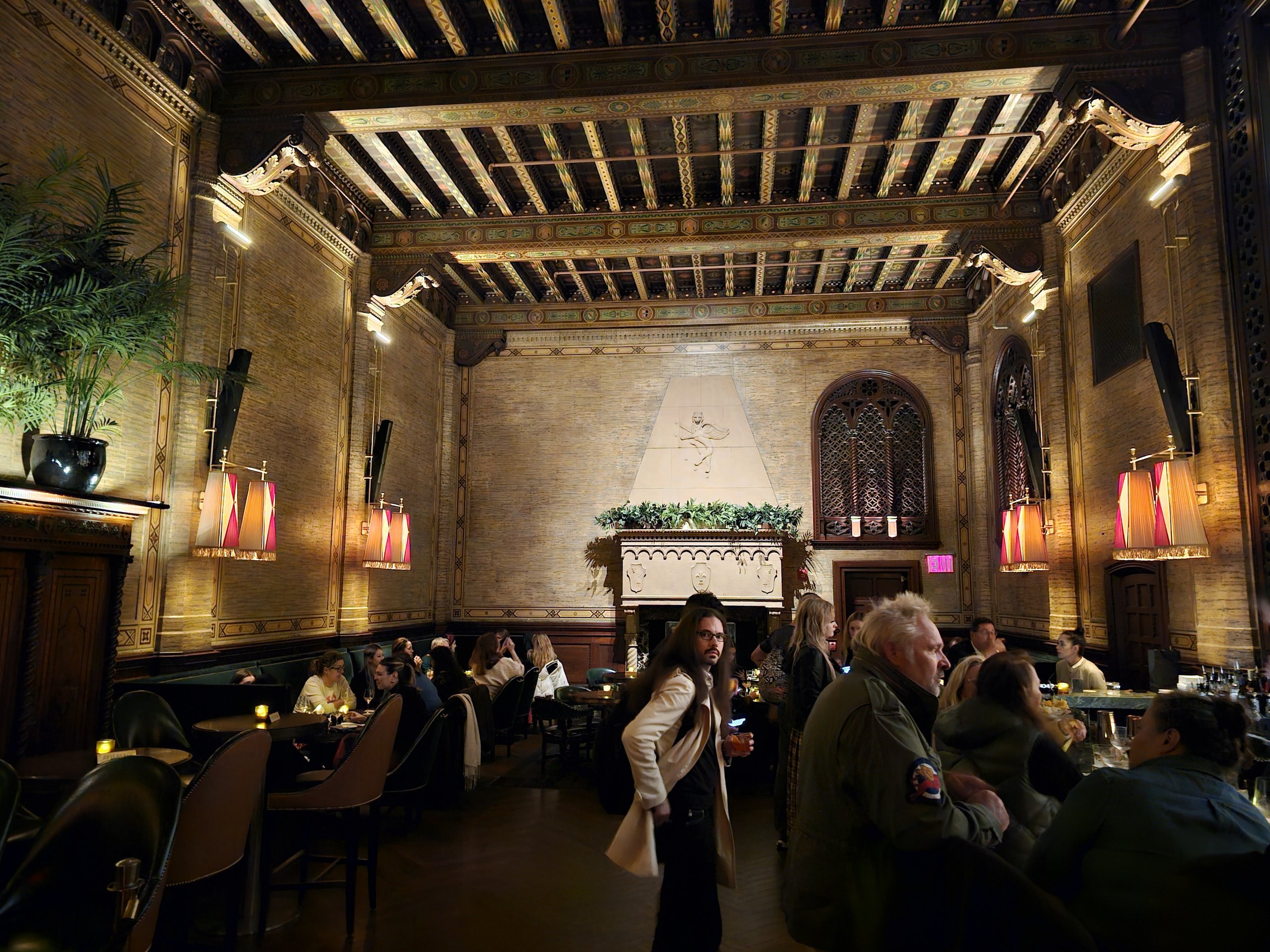 Érdekesek például a bejárat feletti sas szobrok vagy a 4 méter széles, bronzba keretezett, dekoratív ólomüveggel díszített óra.