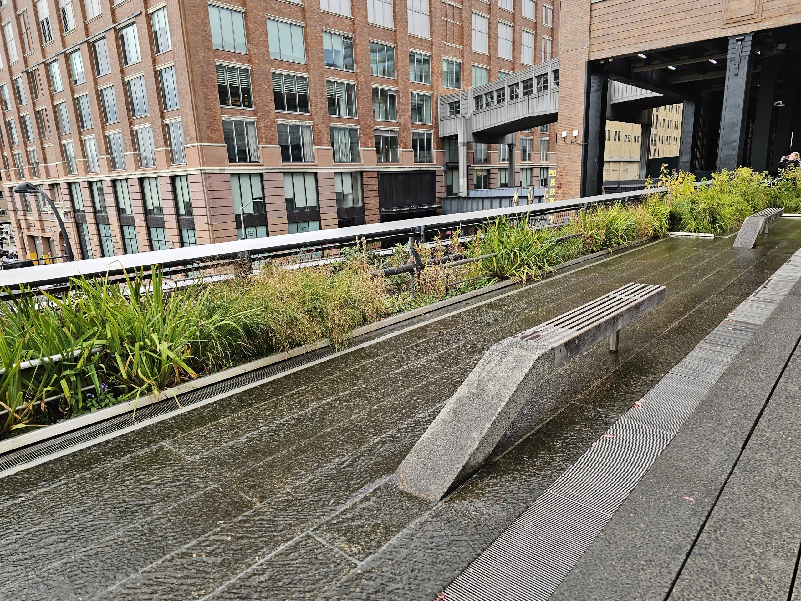 Egyes részeken a régi síneket szándékosan a helyükön hagyták, és közöttük különféle zöld növényeket ültettek, míg máshol új tereket alakítottak ki padokkal, gyönyörű pázsittal és virágágyásokkal.