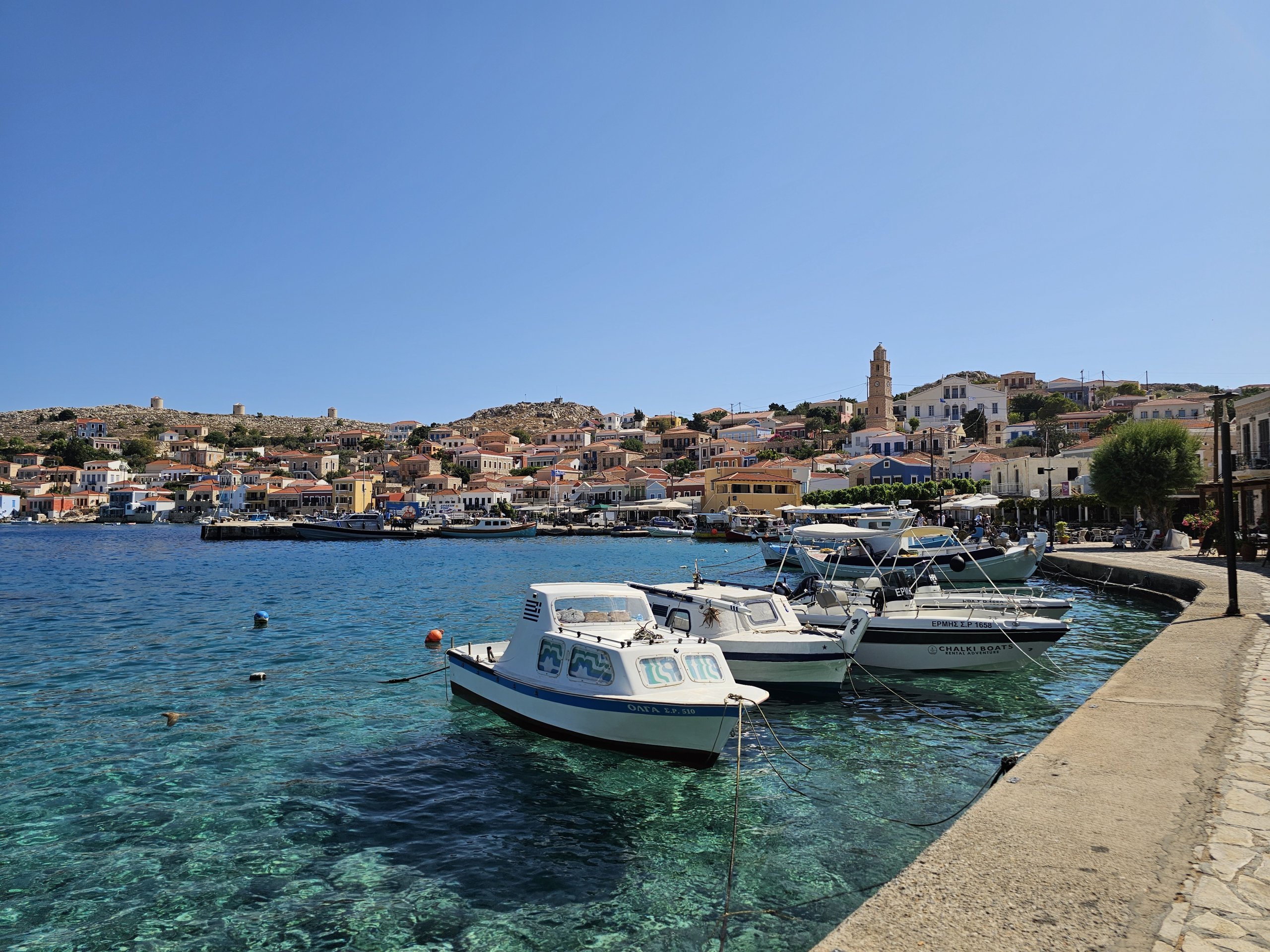 Chalki kikötőfalu az egyetlen lakott település a szigeten, és szinte az összes lakos itt él.