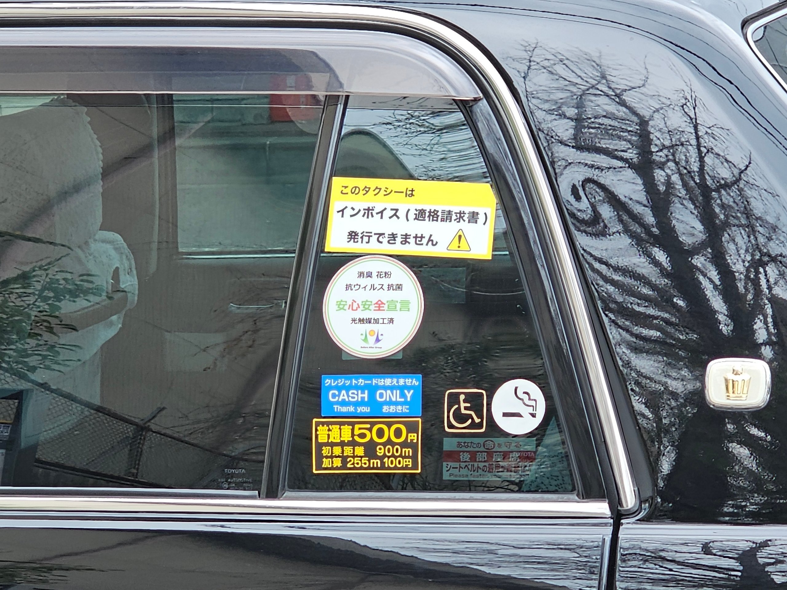 - 80 jpy - minden további 296 méter vagy 1 perc várakozás (a nagyobb taxiknak valamivel magasabb az ára).
