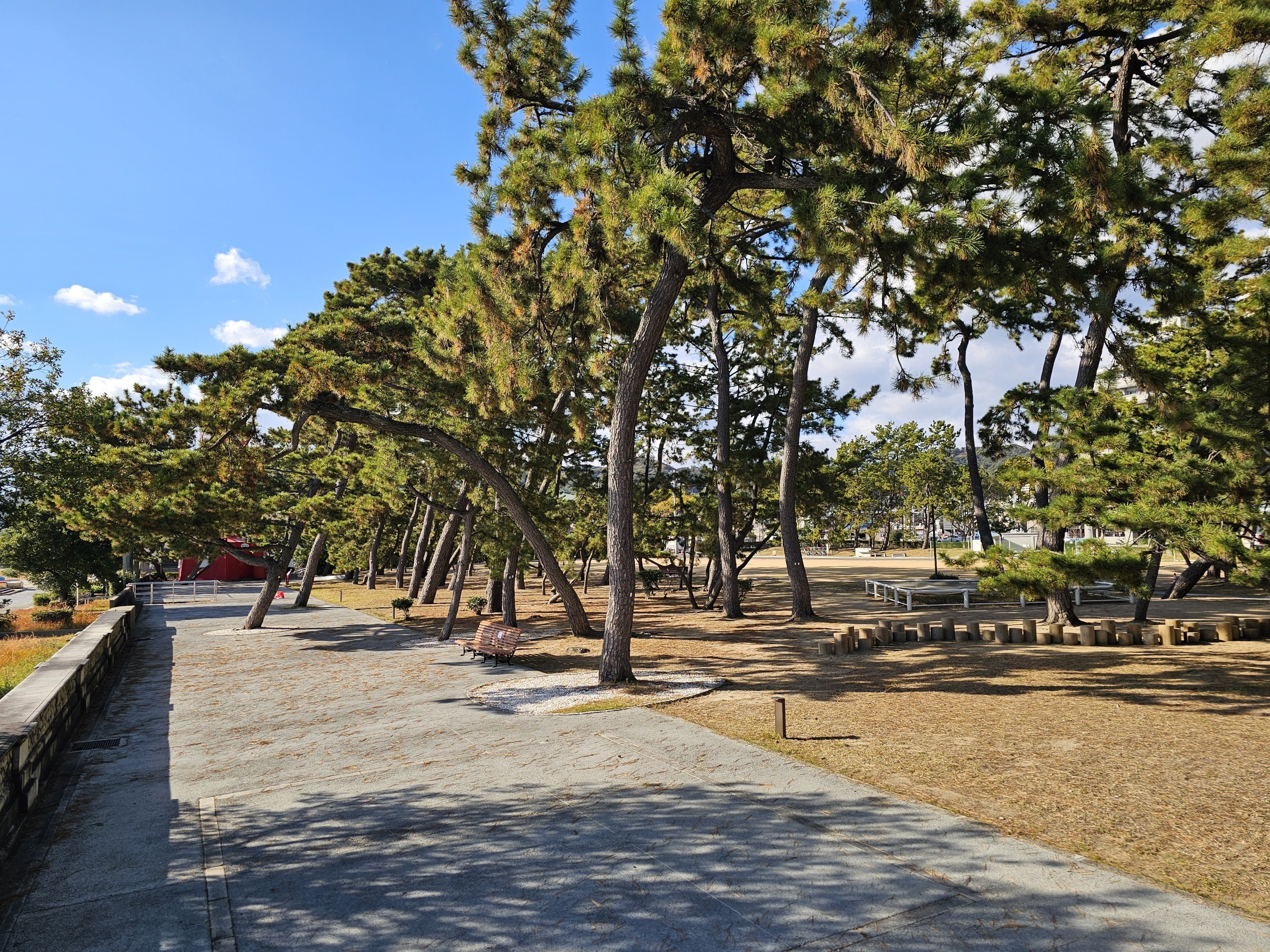 Viszont rengeteg hely van, szép kilátás nyílik a tengerpartra, és ha jók a látási viszonyok, akkor az Akashi Kaikyō hídra is.