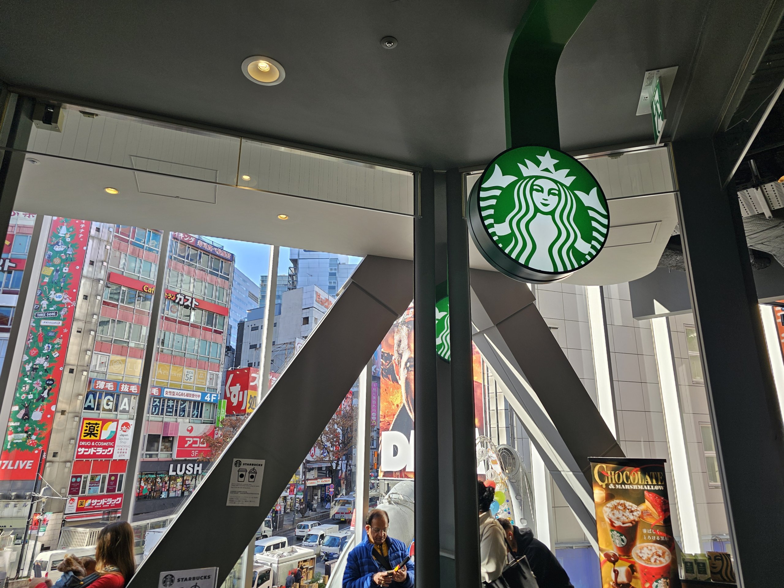 Szép kilátás nyílik a Shibuya kereszteződésre, bár nem olyan tökéletes, mint a Share Lounge, mivel a tetőszerkezet kissé akadályozza.