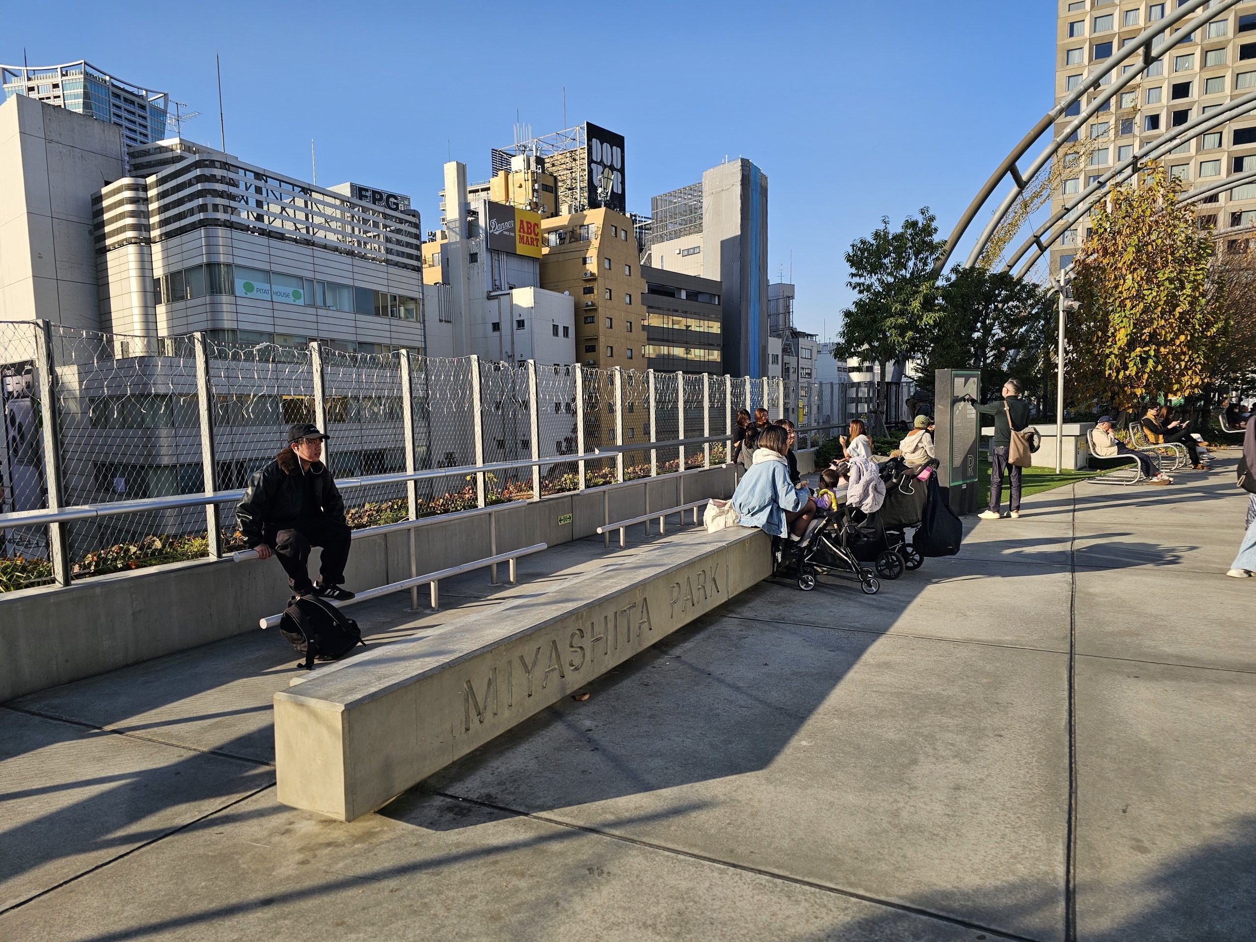 A Miyashita Park egy kicsit a New York-i High Line-ra emlékeztet - ez egy mesterségesen létrehozott keskeny zöld sáv az ipari kinézetű áruházi épületek tetején. Az egyik oldalon a forgalmas YR Yamamote vasútvonal, a másik oldalon pedig a Saikyo Line sínek húzódnak.