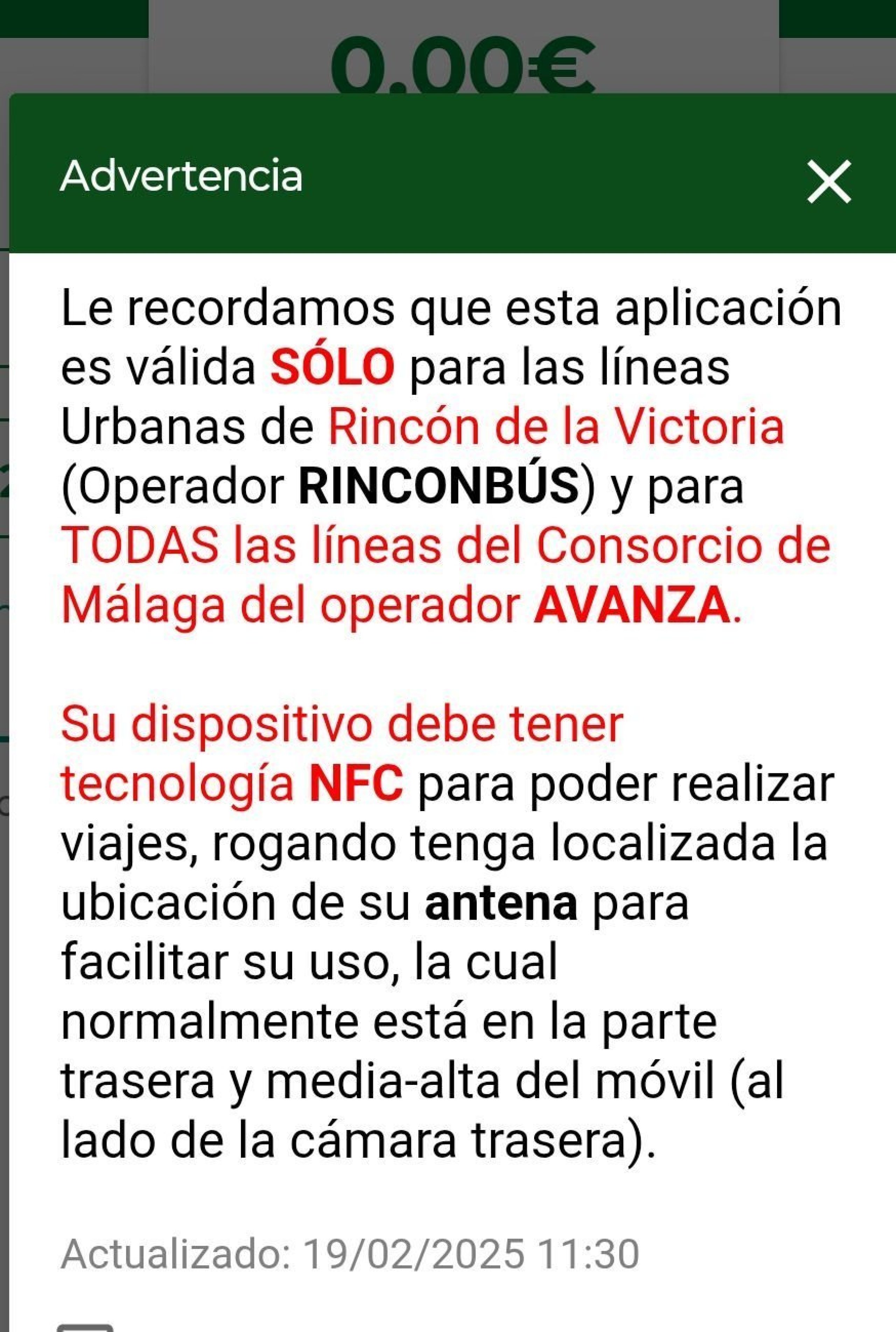 Helló. Követtem a tanácsodat, és ez volt a legnagyobb hiba. A malagai Consorcio de Transporte Metropolitano tömegközlekedésre vonatkozó app teljesen használhatatlan, haszontalan és csak 5€-t költöttem. Az alkalmazás a kísérleti fázisban van, és csak a kiválasztott elővárosi buszokra vonatkozik, nincs mód a városi buszokra vagy a repülőtéri járatokra. Ugyanakkor az alkalmazás hatástalan, ha angolra állítod, csak spanyolul működik a buszon. Összefoglalva: "nem akarok ingyenes kedvezményt" és teljesen haszontalan, félrevezető és hamis információ. Köszönöm szépen.