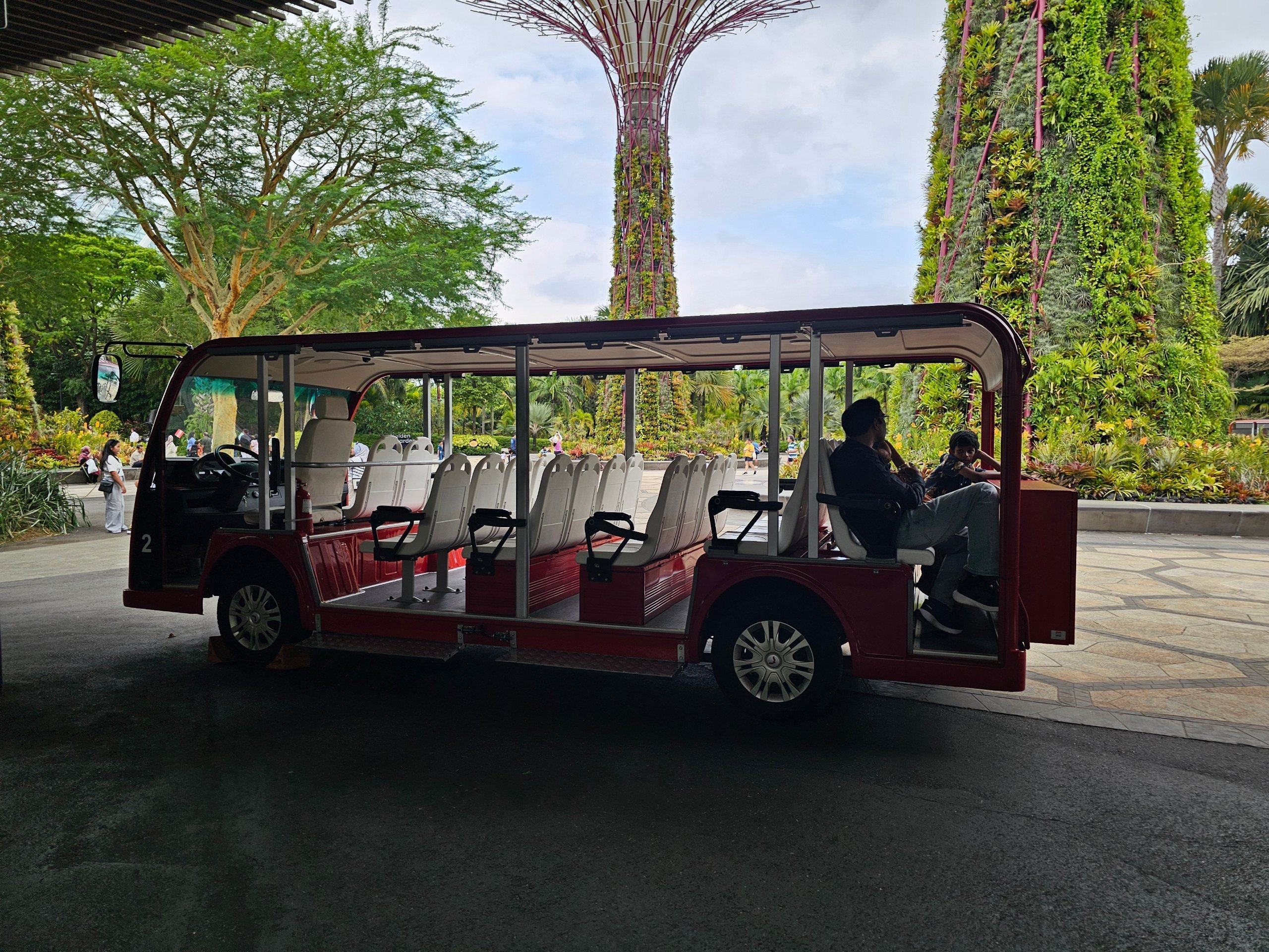 A főbejárattól, amely a déli oldalon van (a Marina Bay Sands szállodával szemben), 10 sgd-ért elektromos kocsis túrát is lehet fizetni. A bejáratnál szekrények is vannak a csomagok tárolására.