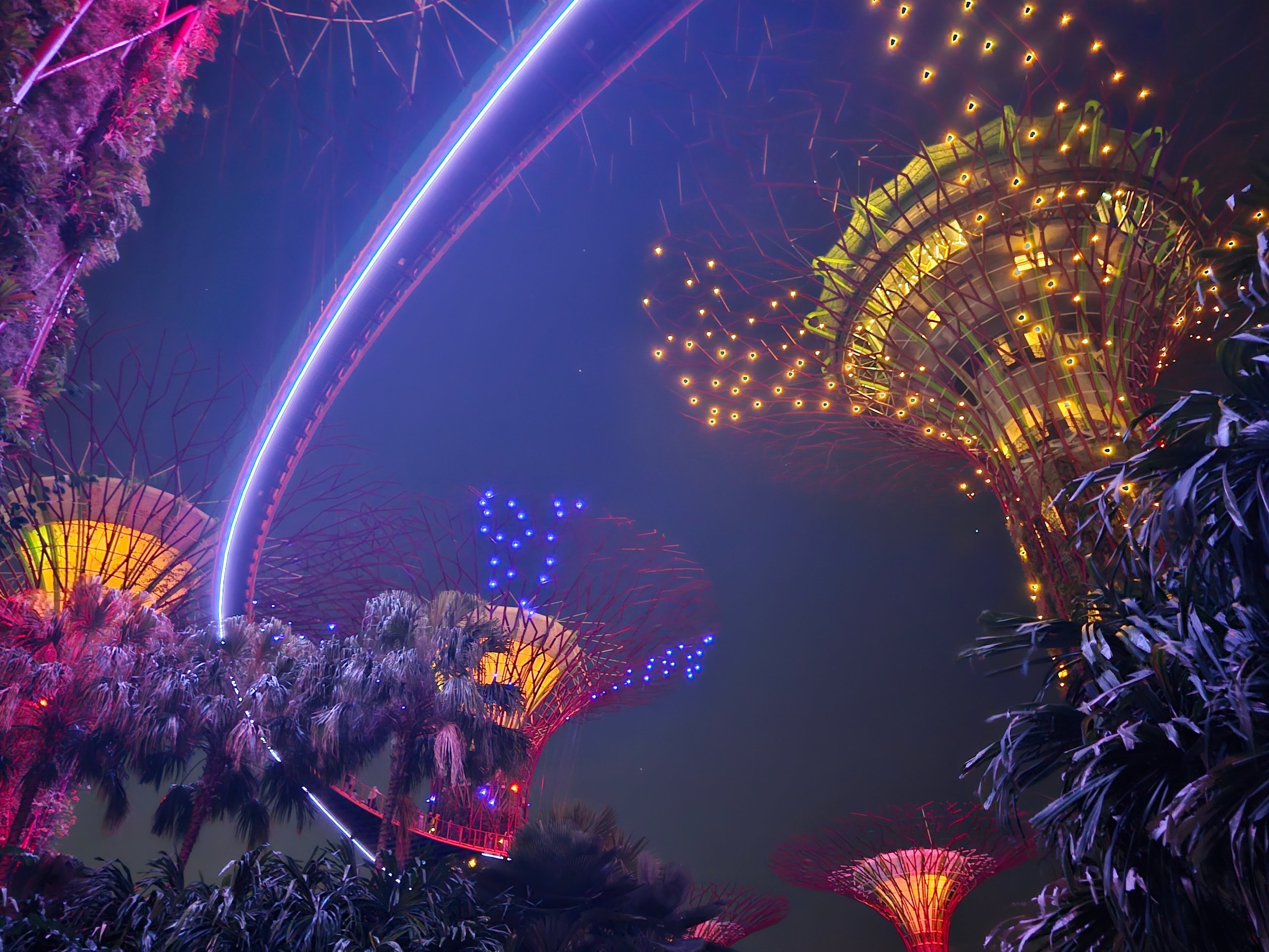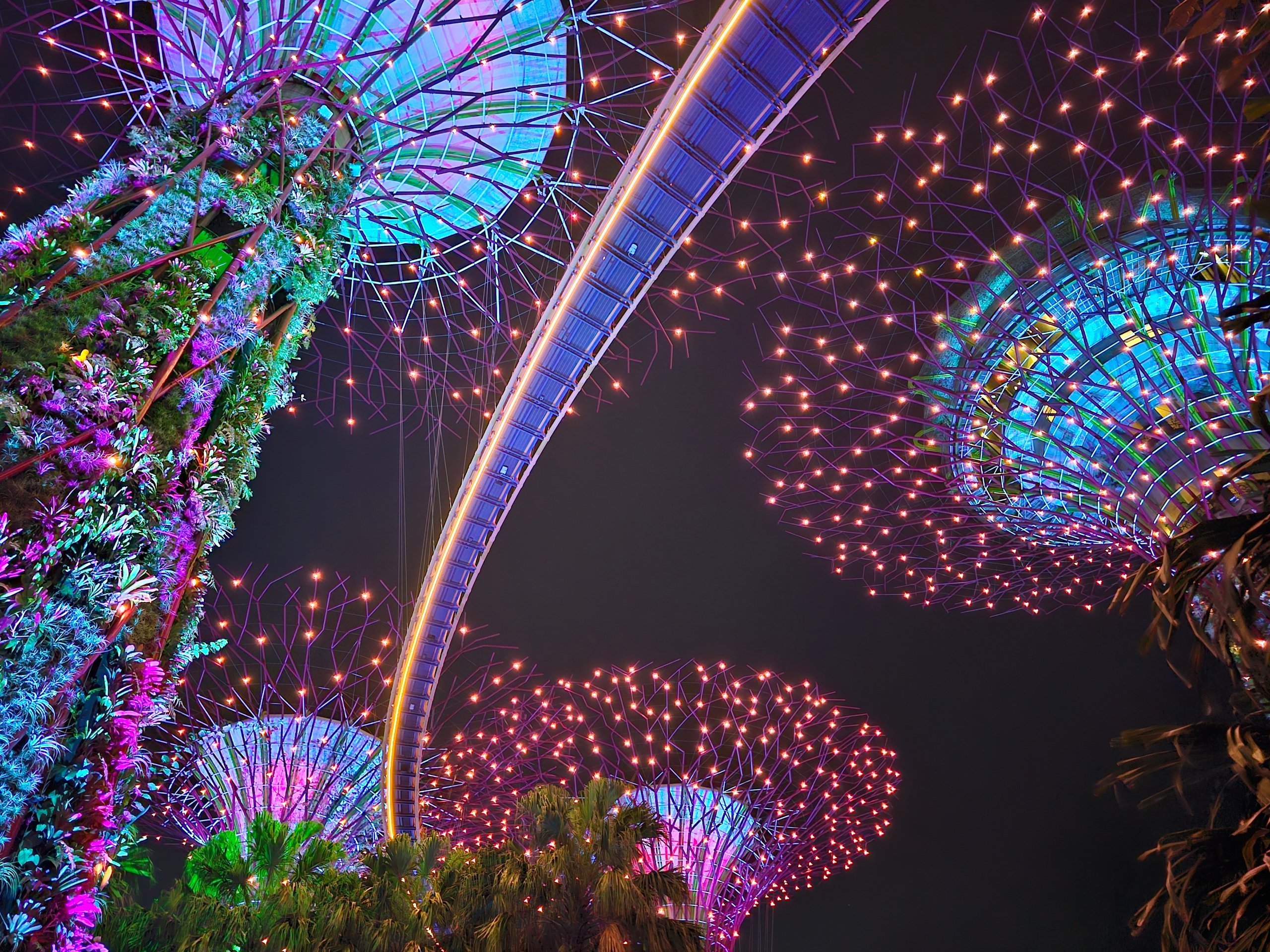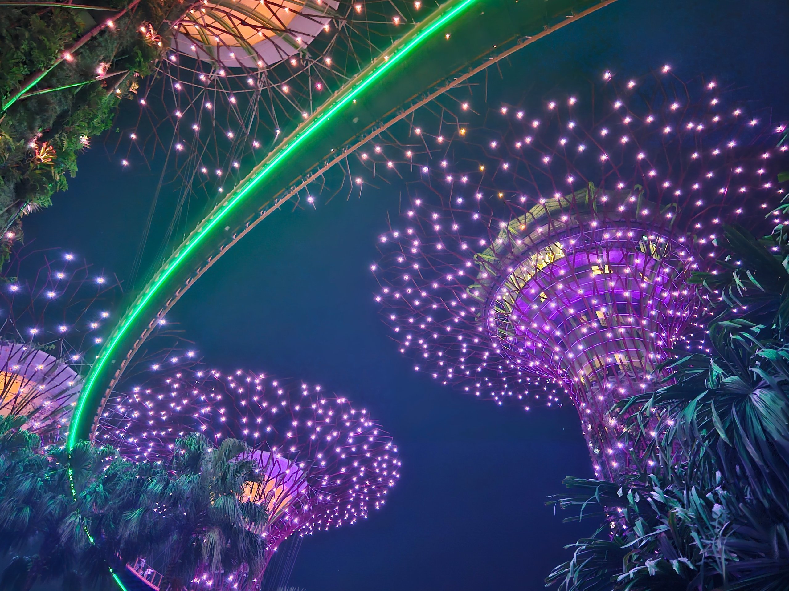 A Garden Rhapsody fény- és zenés show minden nap a Supertrees között zajlik. A fák fokozatosan világítanak, színt váltanak, és az egész sokkal jobban működik, mint azt a képek alapján gondolnád.