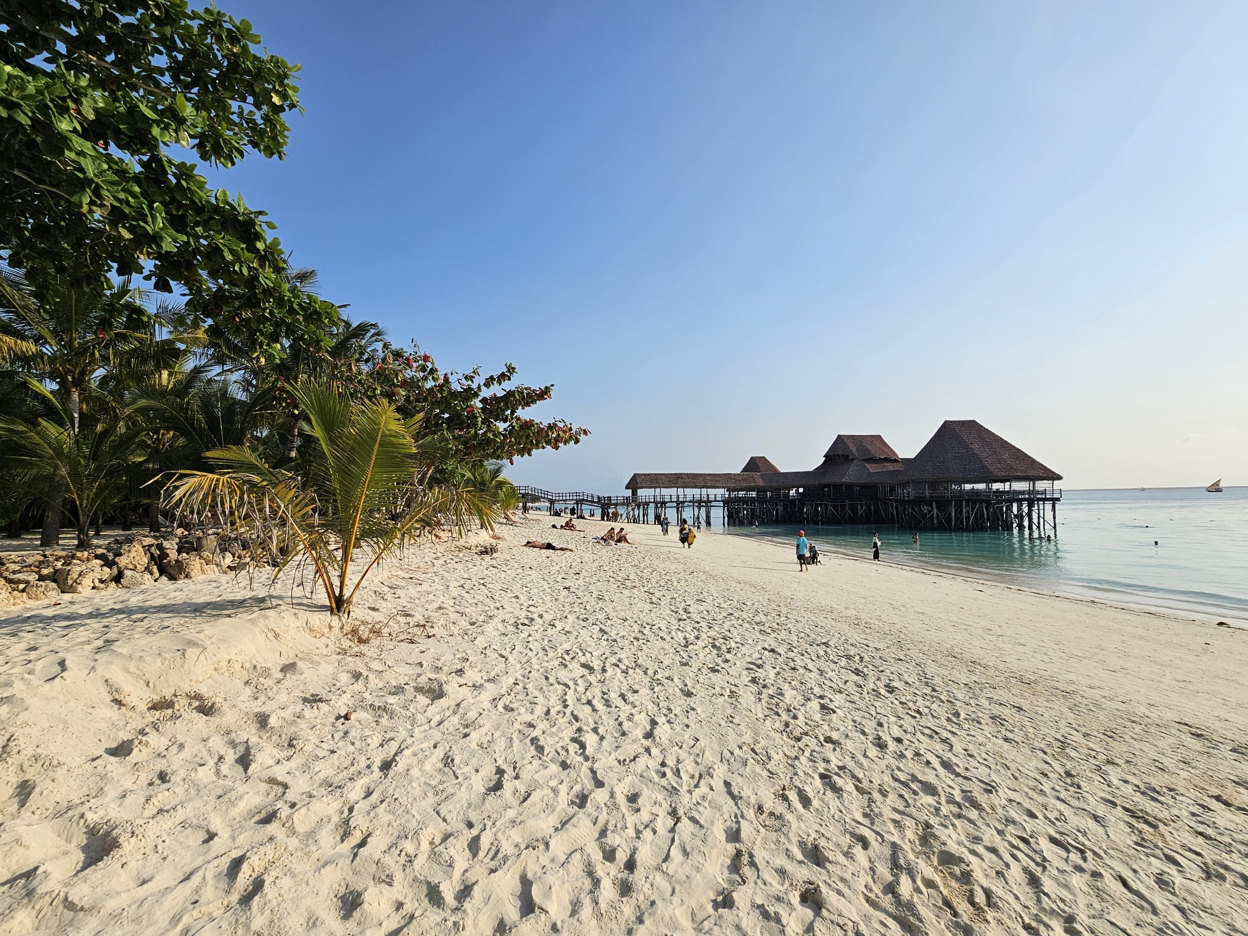 A helyi strand határozottan a legszebb, amit Zanzibáron meglátogattam, és a keleti parton lévő strandokkal ellentétben még apály idején is lehet úszni a tengerben.