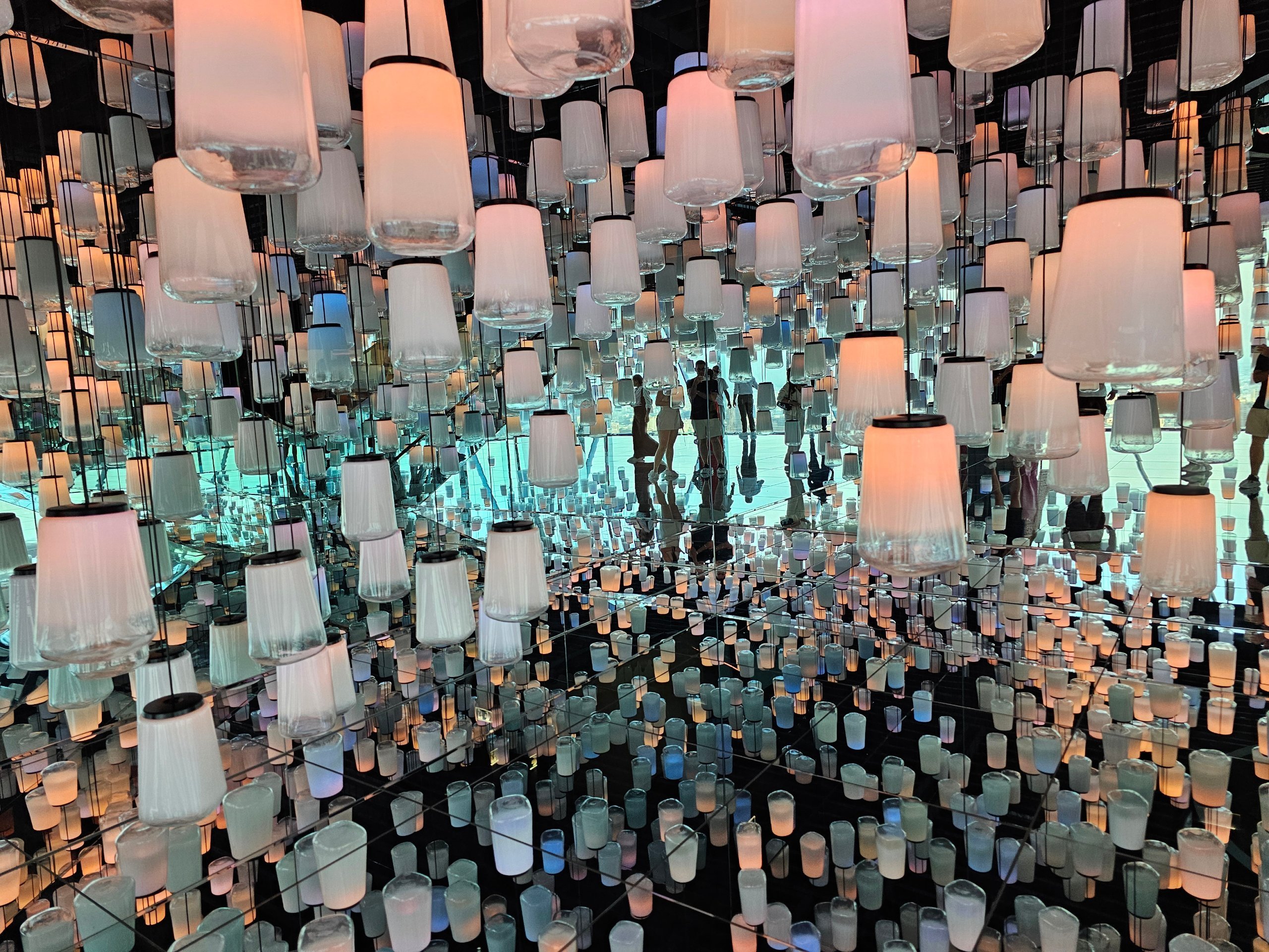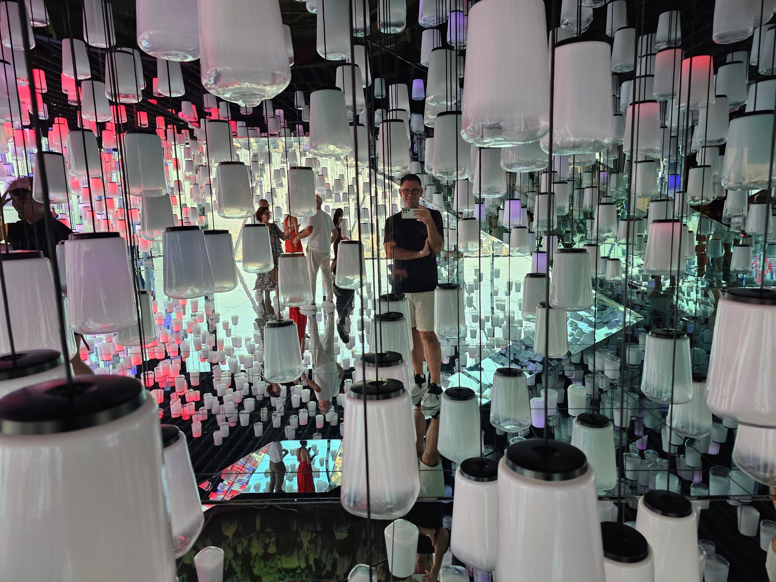 A lámpás hagyomány által inspirált installáció, ahol a fényhatások a végtelen tér érzetét keltik.