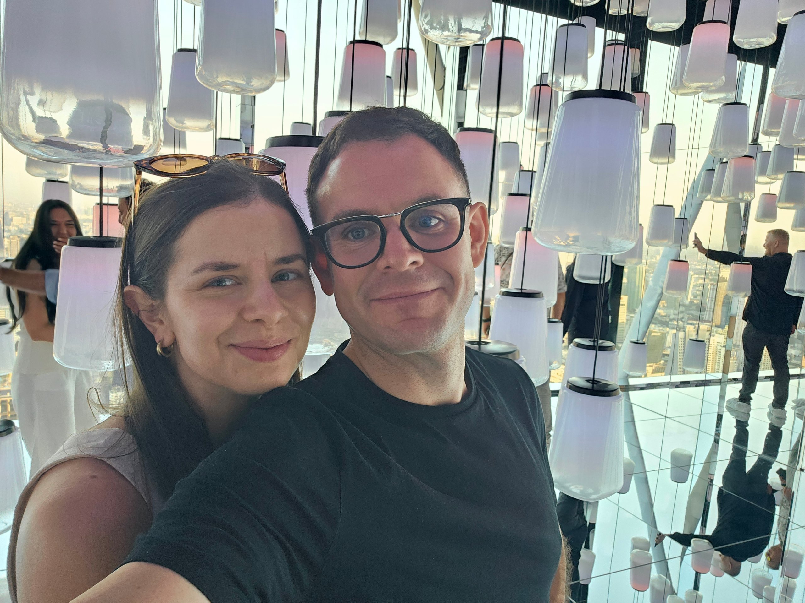 Egy kétszintes tükrös kilátó 360°-os kilátással, ahol gyönyörűen tükröződnek az emberek és a város a háttérben.