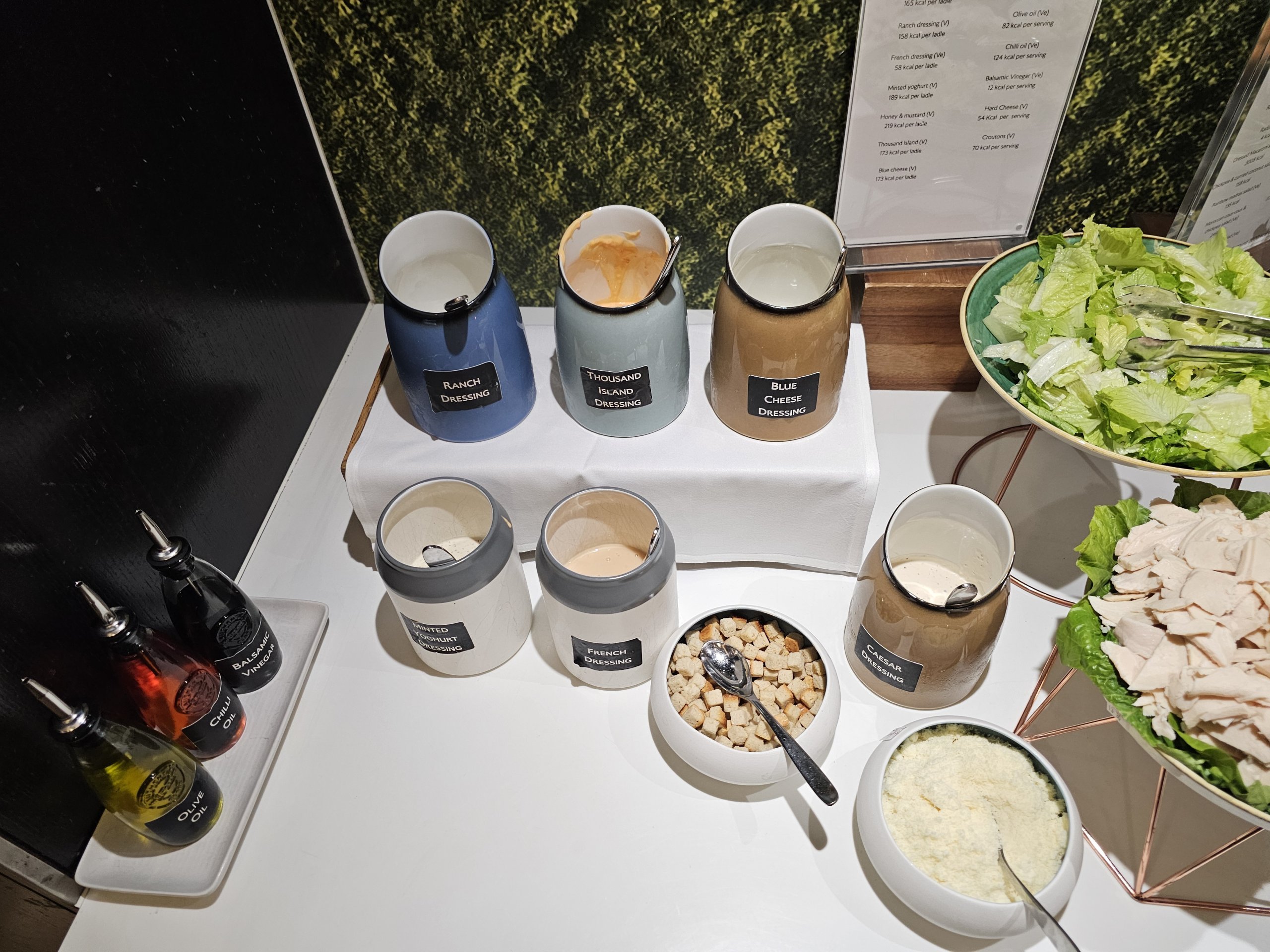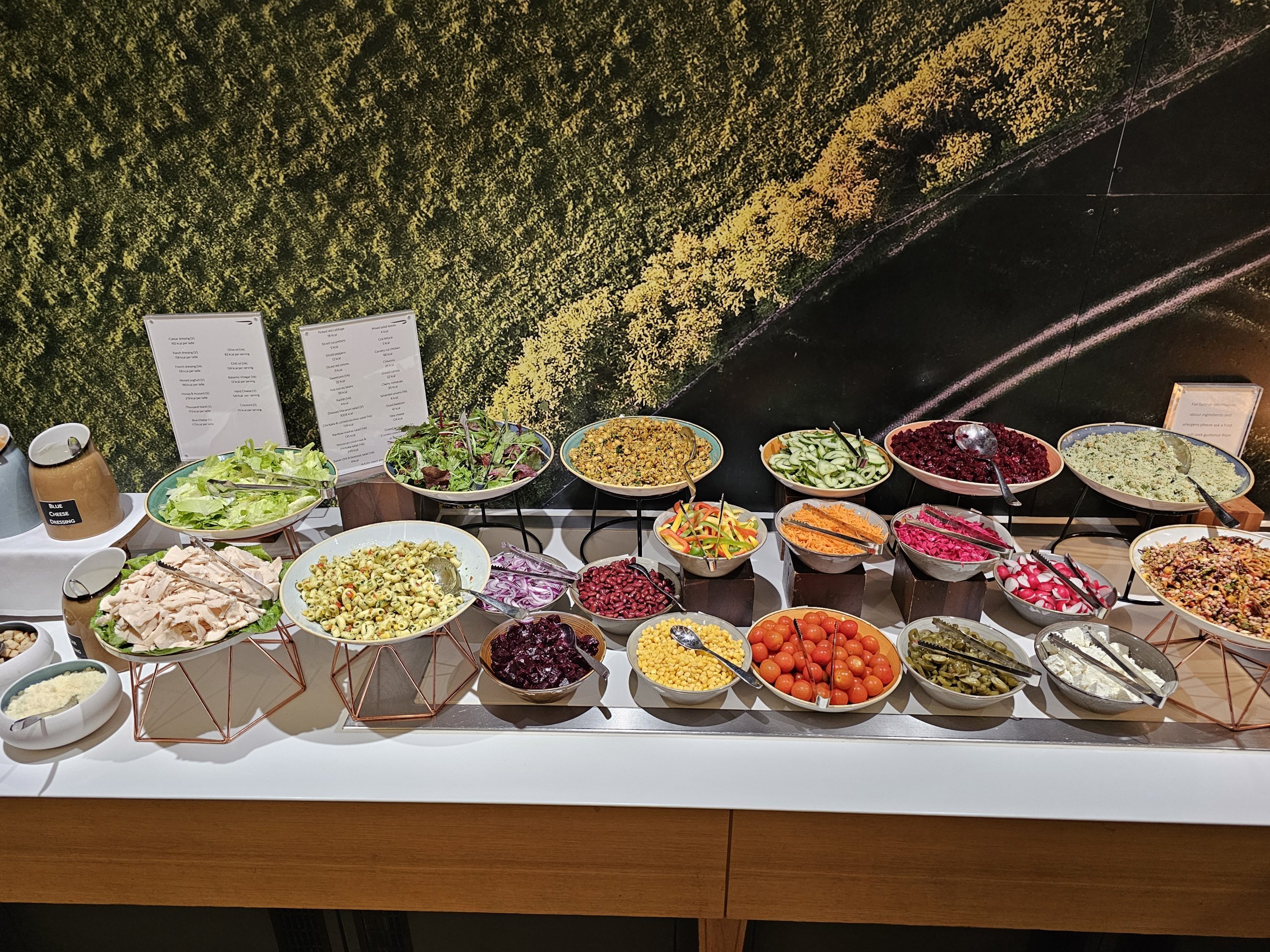 A hideg ételek menüje tartalmaz néhány zöldséget, salátát különböző öntetekből választhatóval és egy nagyon korlátozott és gyenge süteményválasztékot (gyakorlatilag csak édes).