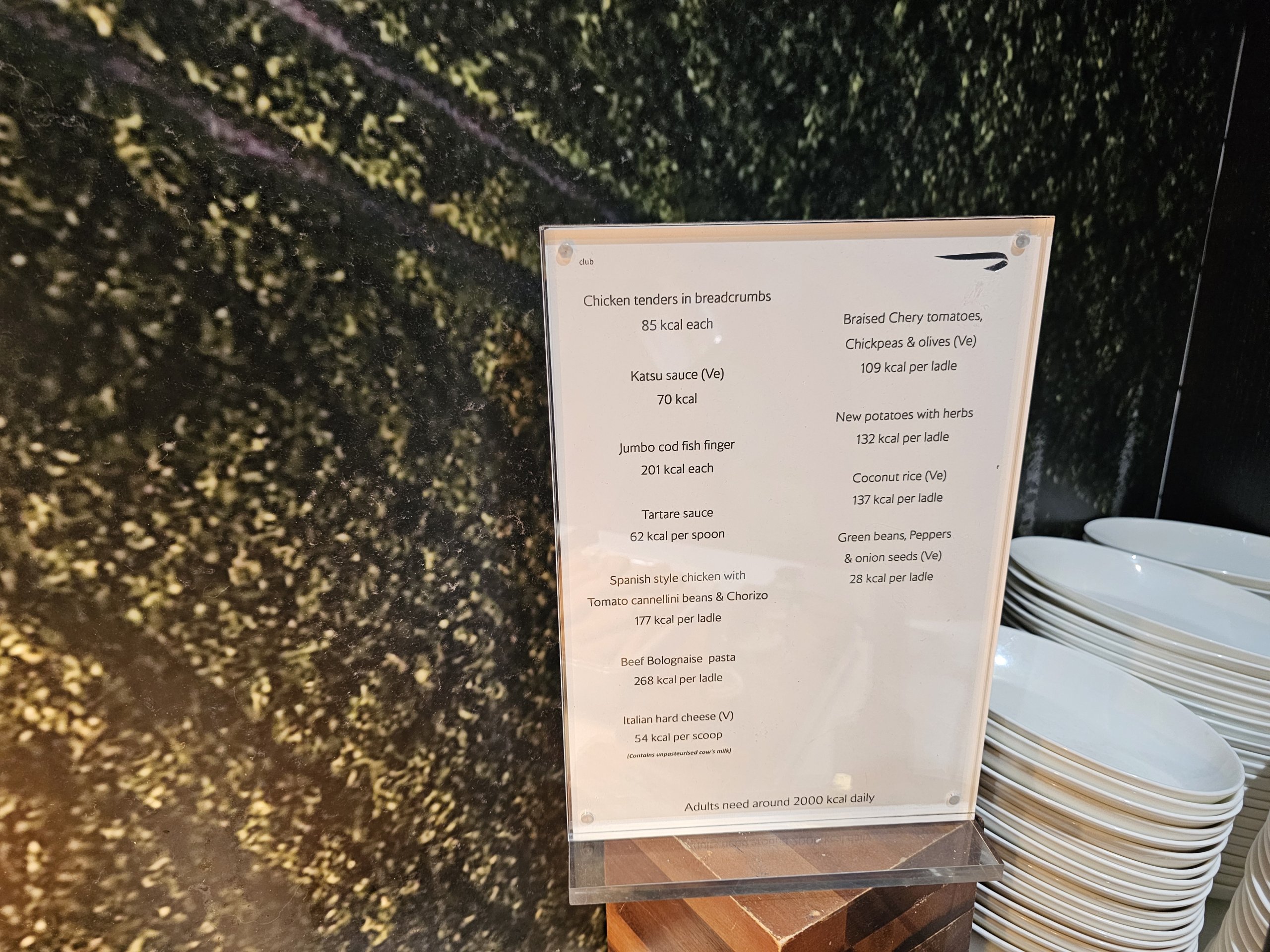 Pozitívum, hogy van egy tábla a kínált ételek kalóriatartalmával.