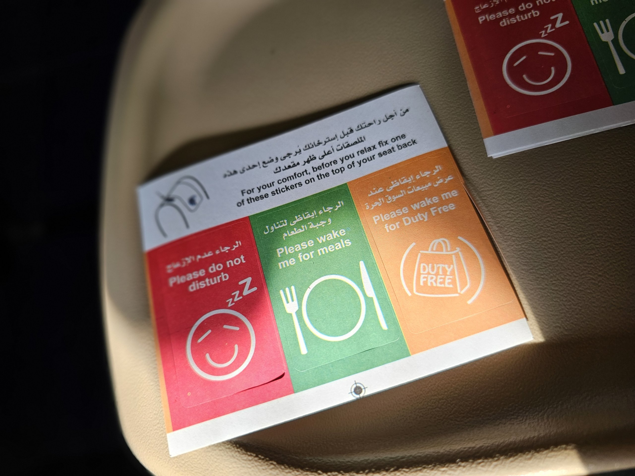 Kedves részlet a matricák a személyzetnek szóló információkkal, ha étkezéshez szeretnénk, hogy felébredjünk, vagy épp ellenkezőleg, nem akarjuk, hogy zavarjanak a repülés alatt. Az Ön által választott matricát az ülése tetejére ragasztja.
