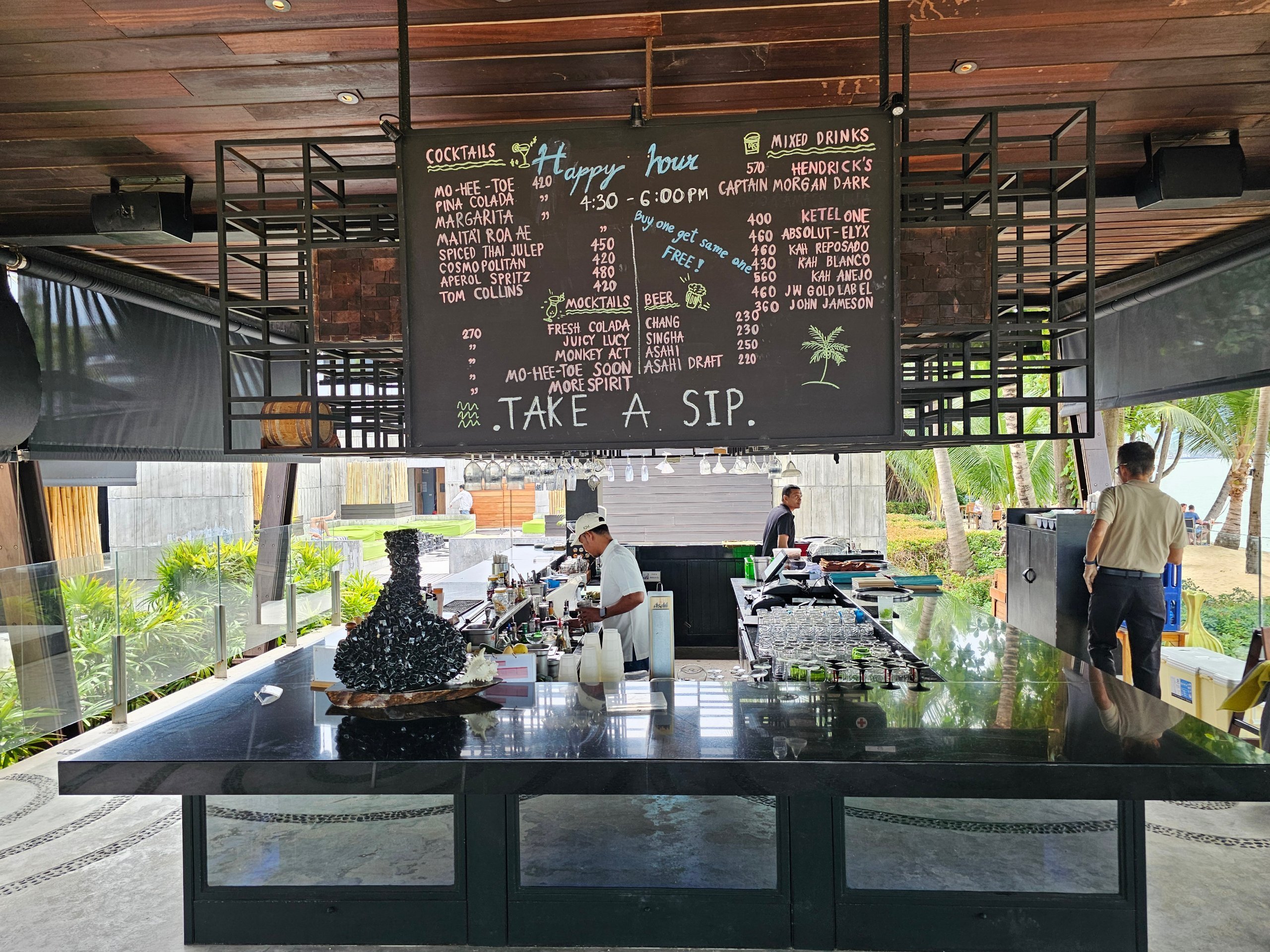 A standard bárpultot egy nagy, kör alakú "medence" egészíti ki, szinte a felszín alá süllyesztett kanapékkal és a "W" betűvel. A hangulatot a tengerre és a közeli Koh Phangan szigetre nyíló lélegzetelállító kilátás teszi teljessé.