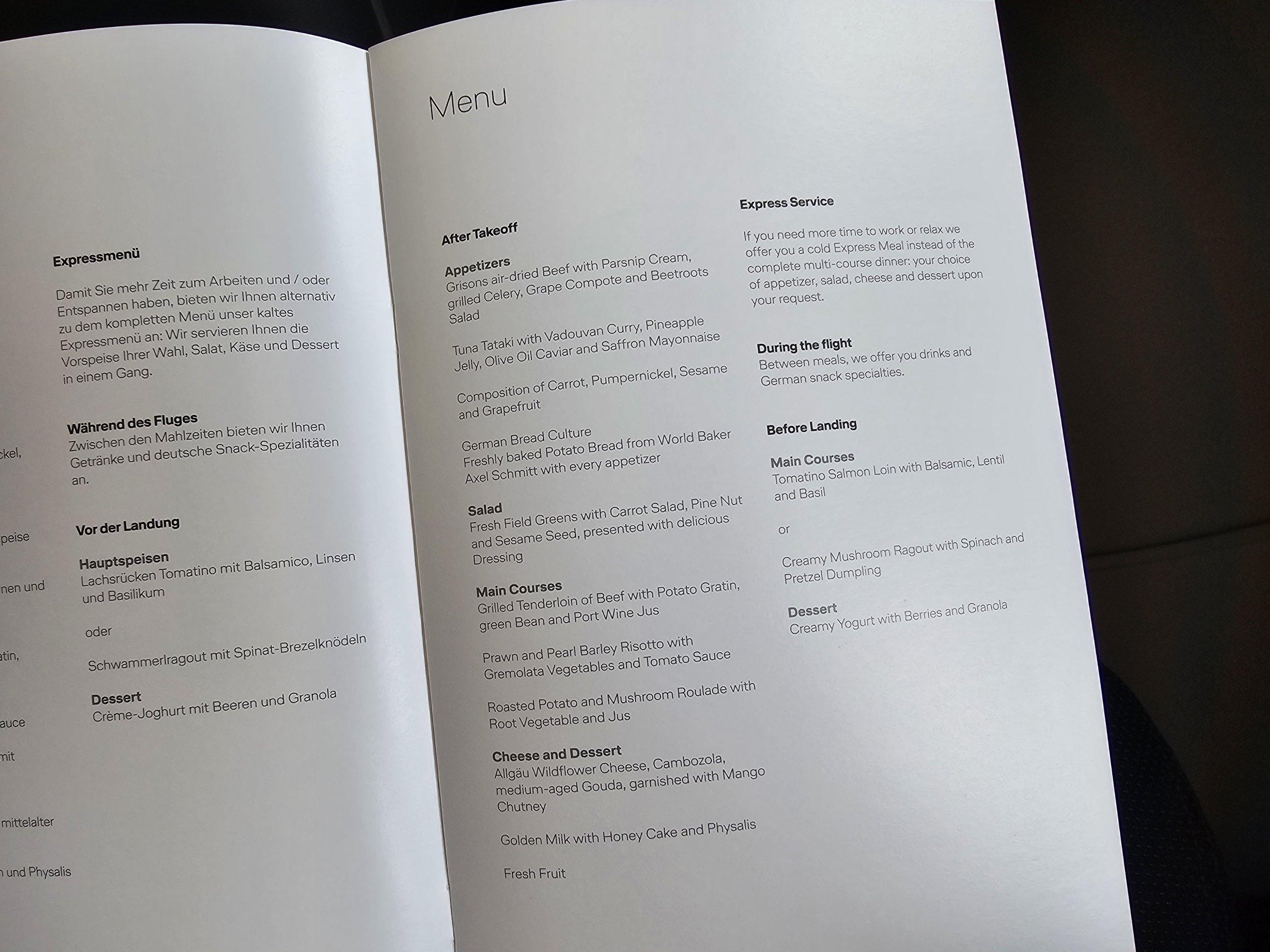 Szerencsére a lufthansa.com/menus-in-business-class oldalon már a repülés előtt tanulmányozható az étlap.
