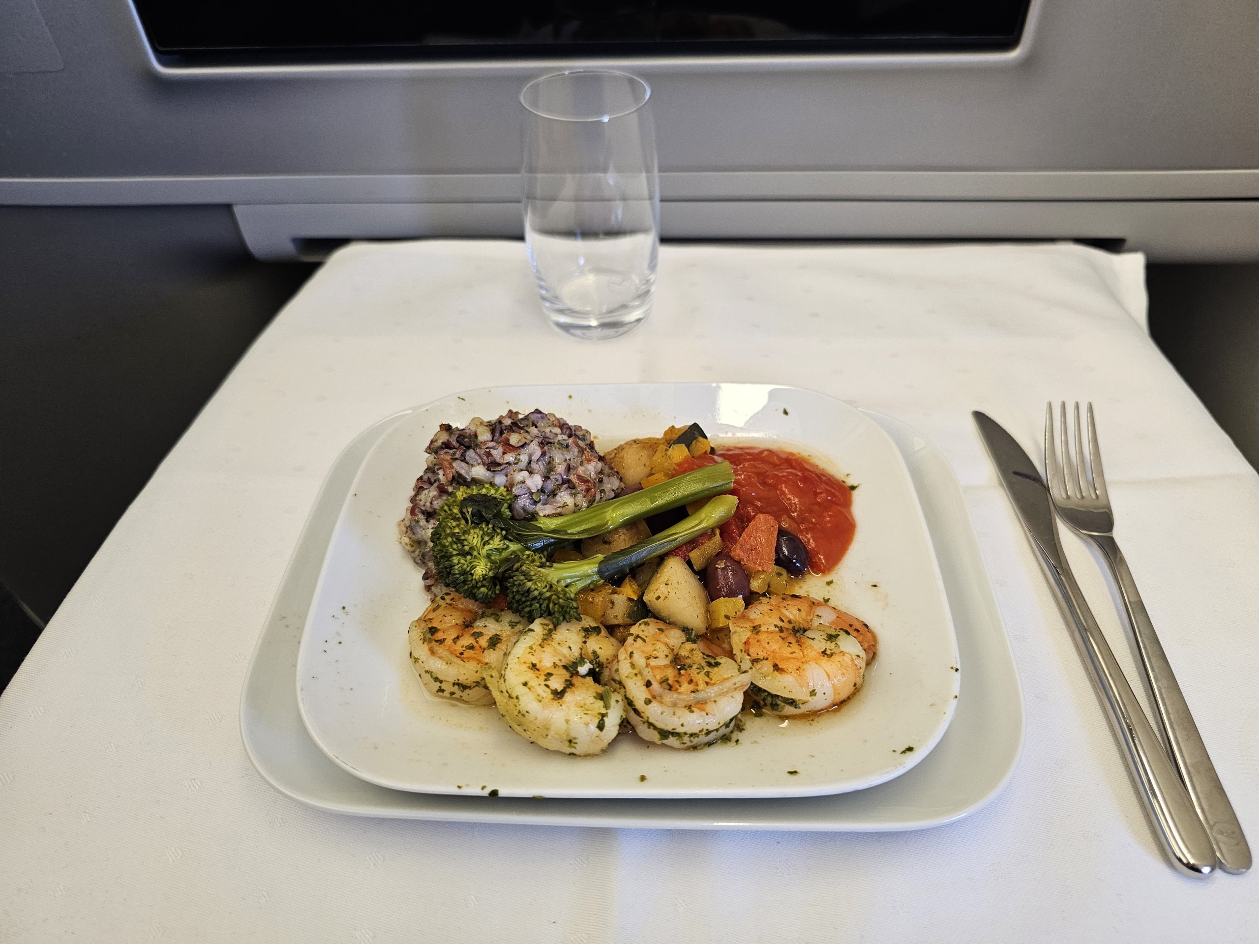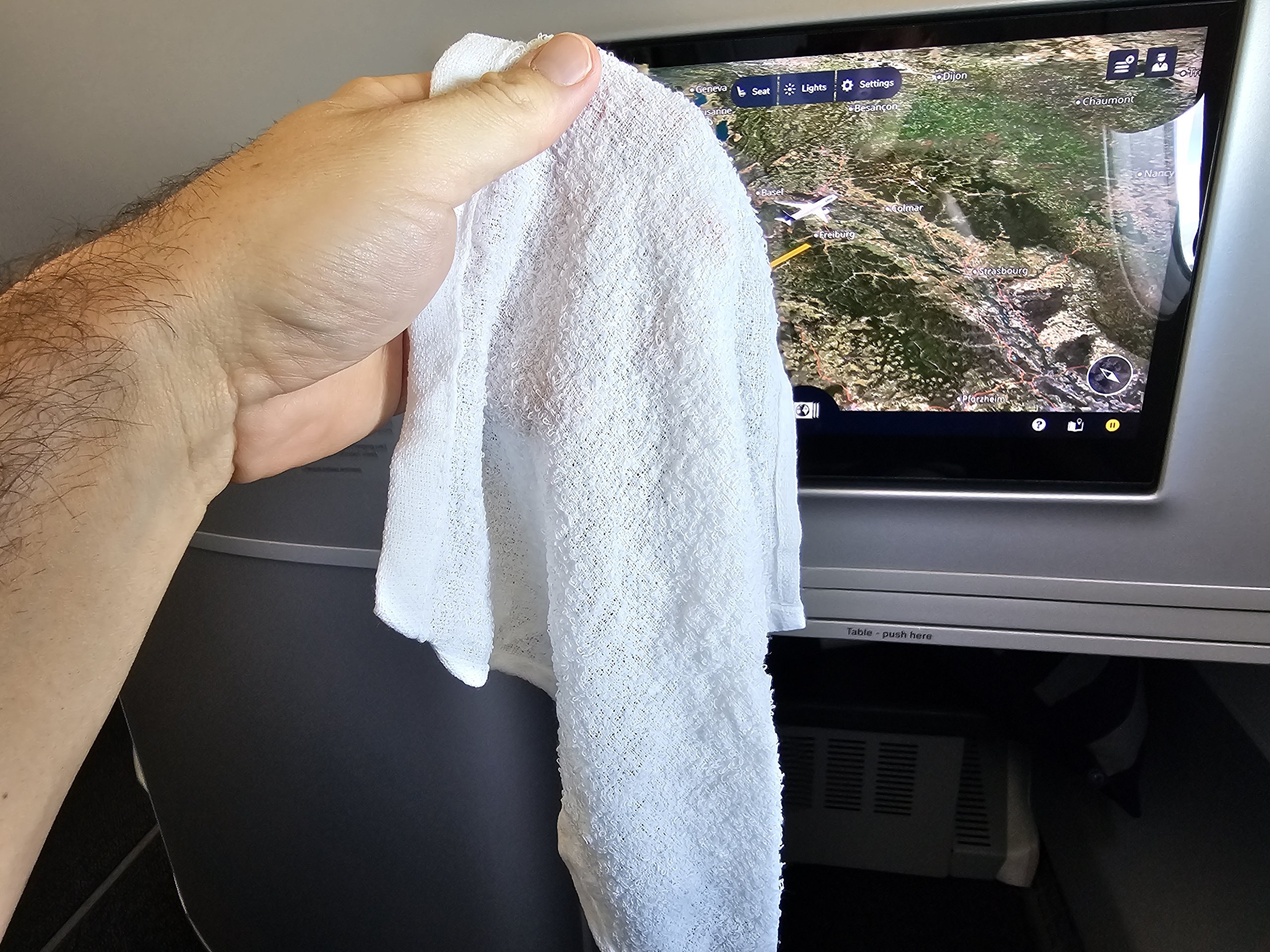 A főfogás körülbelül egy órával a felszállás után érkezik. Az étkezés előtt megkapjuk a hagyományos forró nedves szalvétát, amit leszállás előtt még egyszer kiosztanak.