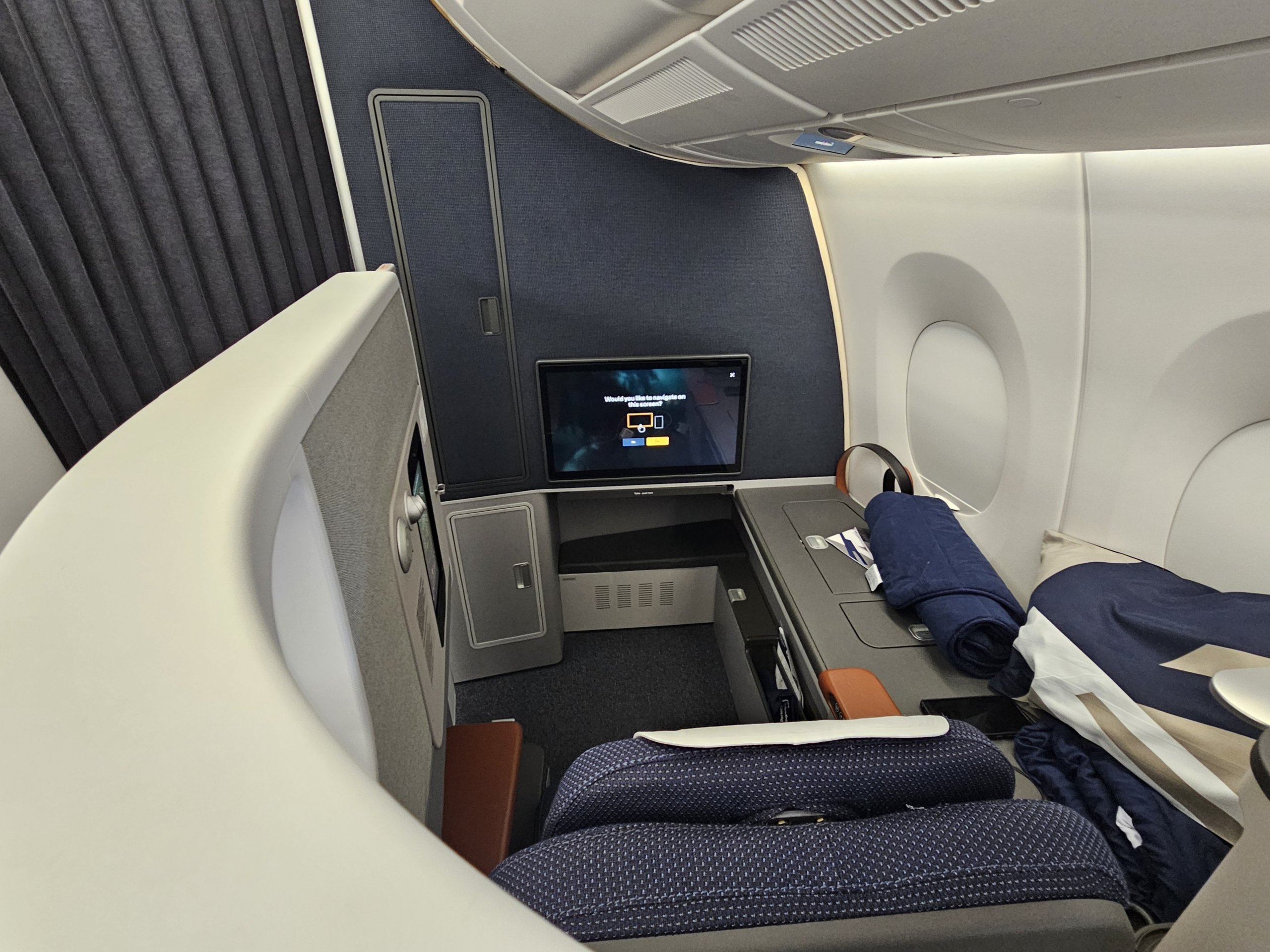 Egy alig néhány hónapos Airbus A350-900-as repülőgéppel repülünk, a business osztályú kabin első ránézésre újnak és modernnek tűnik.