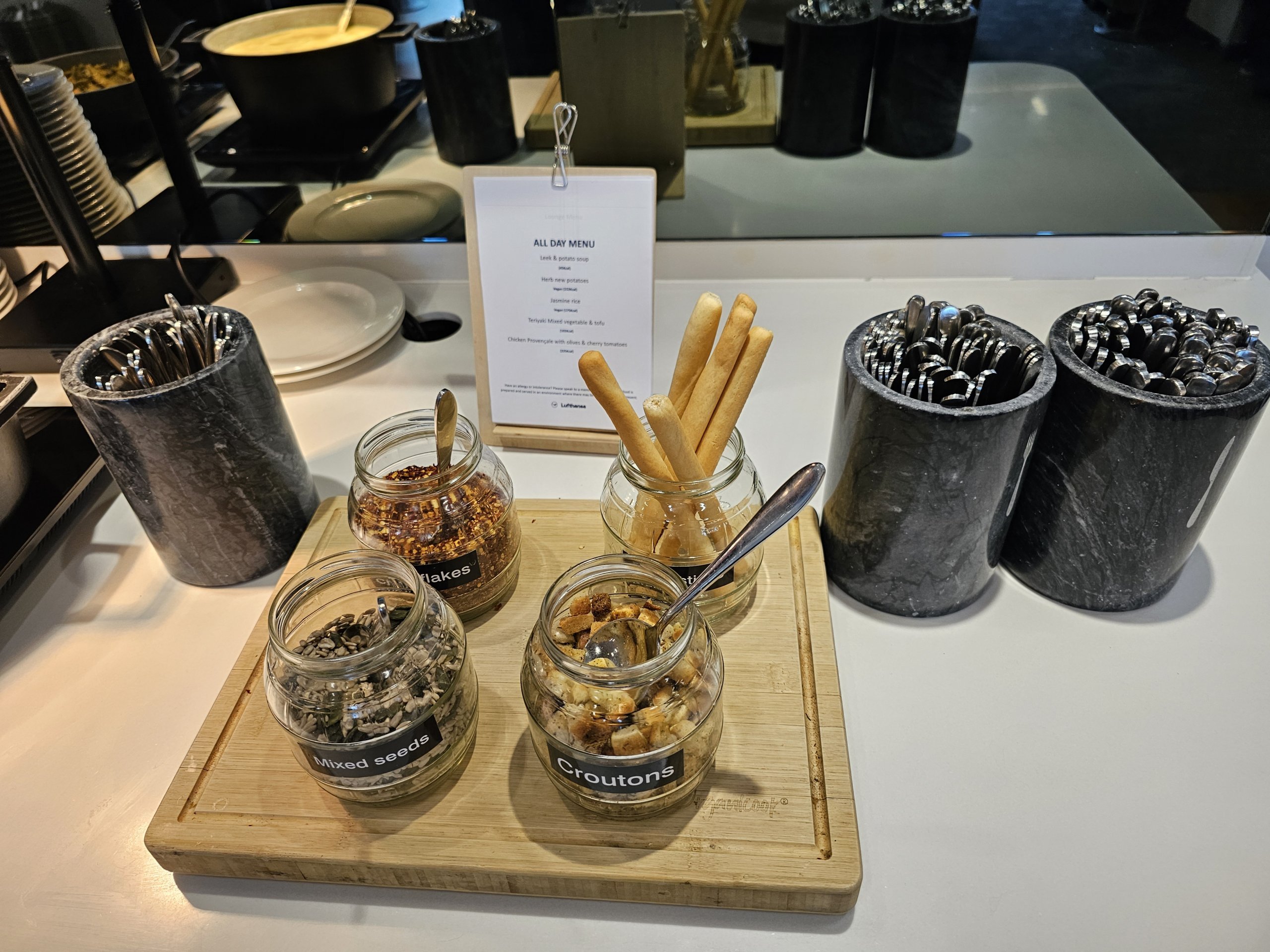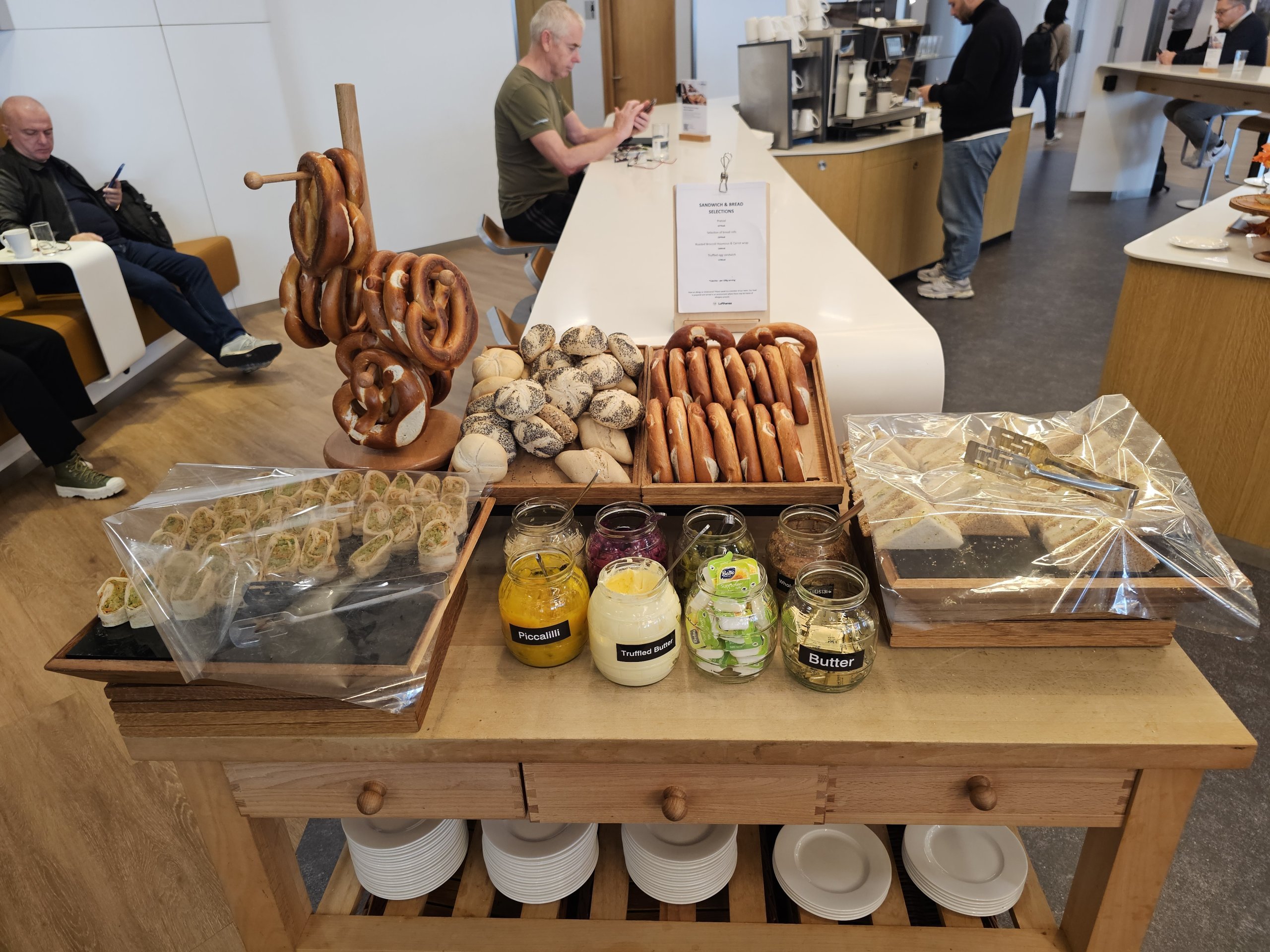 A Lufthansa Lounge a Heathrow repülőtéren egy elég kellemes hely, ahol el lehet fogyasztani egy gyors harapnivalót a járat előtt, valamint a sok laptop-barát asztalnál gyorsan lehet dolgozni.