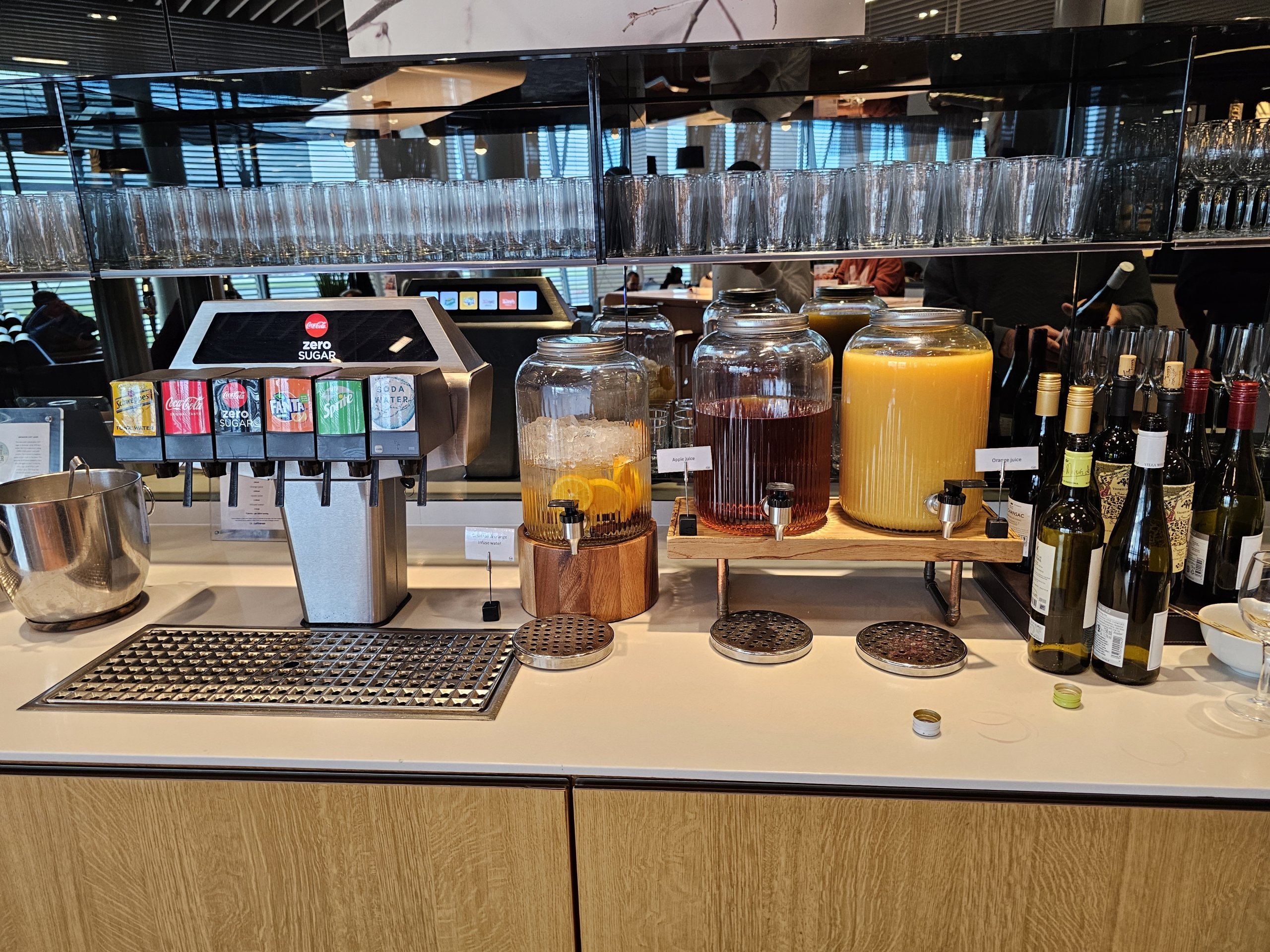 A frissítőpultok kompakt módon, a váróterem egy részén, a bejárattól jobbra helyezkednek el.