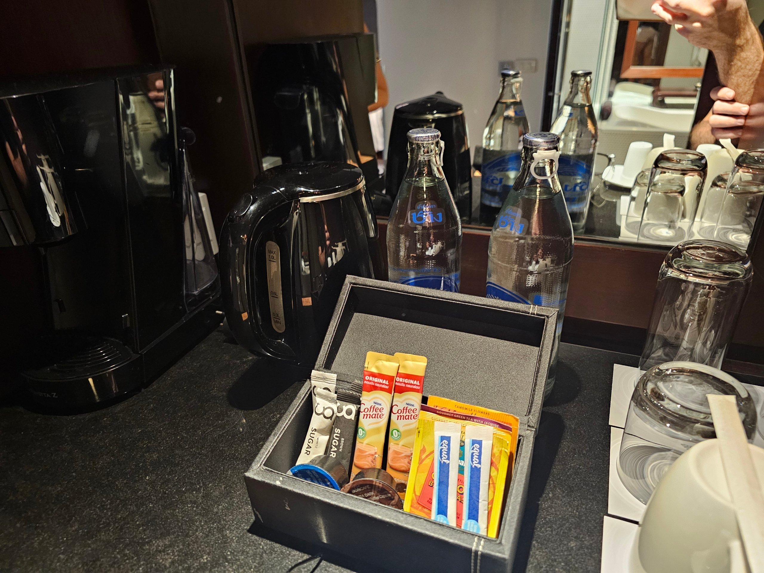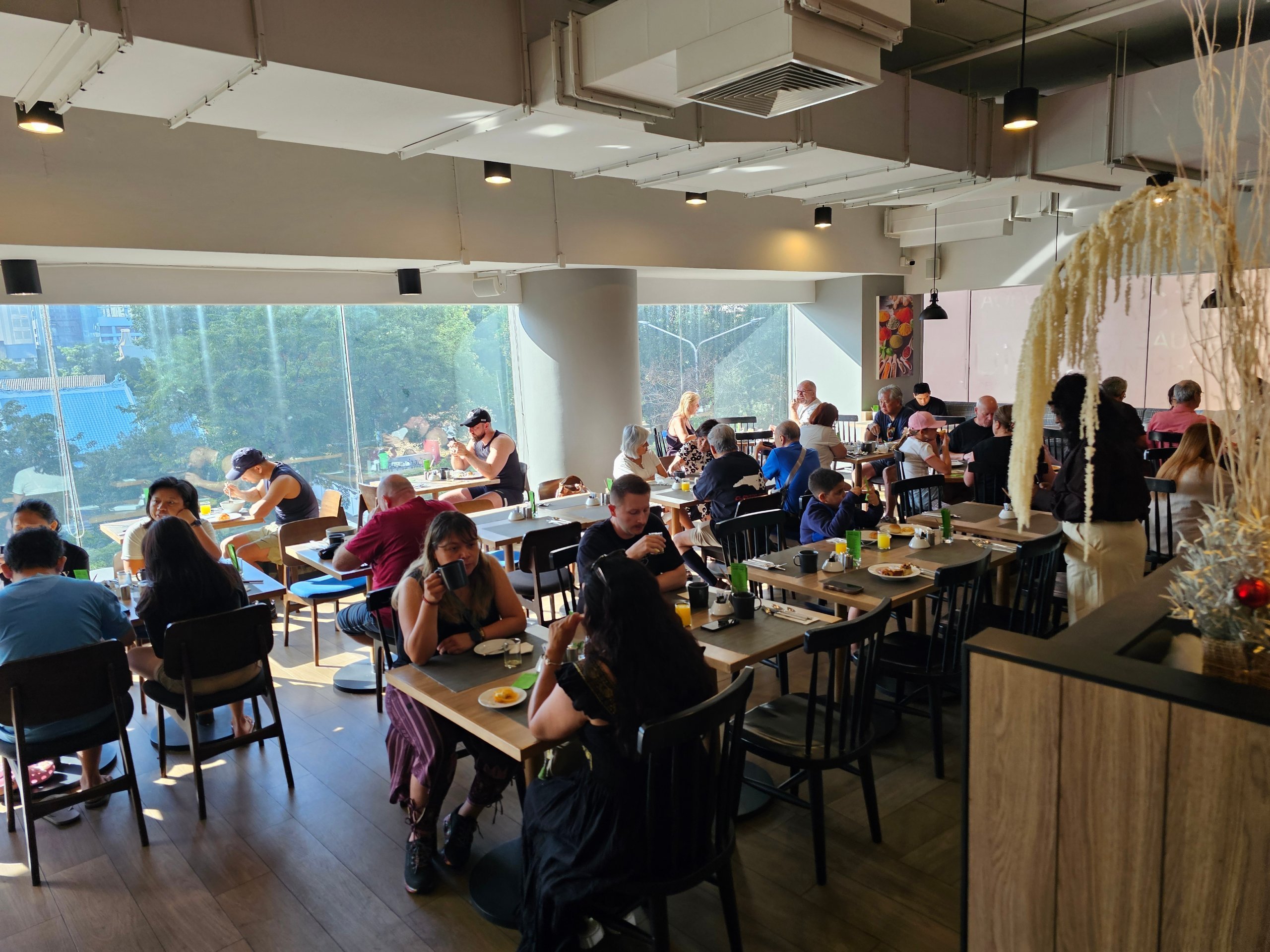 A szoba meghatározó eleme a teljes falon átívelő hatalmas ablak, amelyből a magasabb emeletekről nagyon szép kilátás nyílik a Silom felhőkarcolókra.