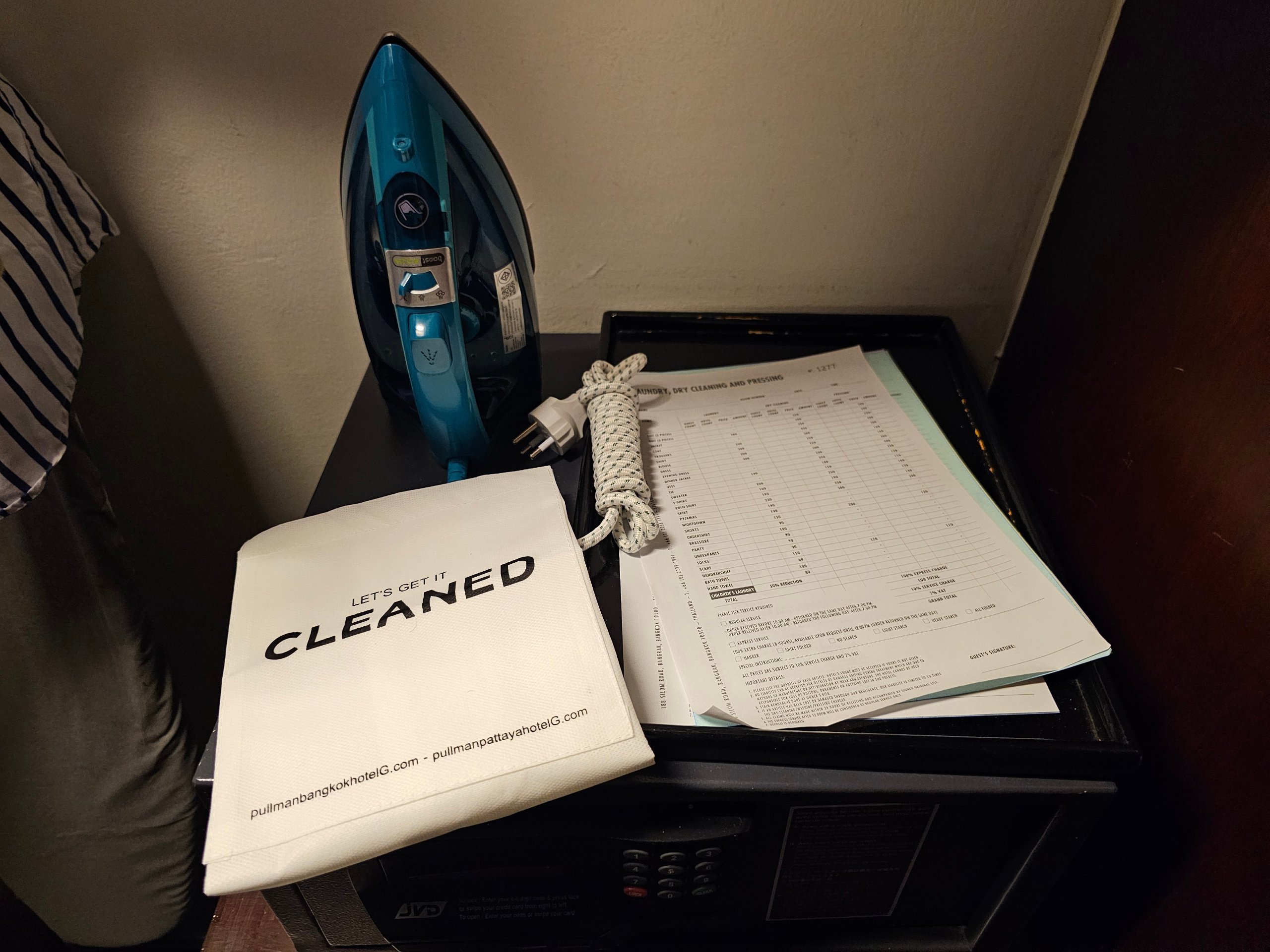 A szobához tartozik egy nagyon kis szekrény is, ami nem mindig magától értetődő a bangkoki szállodákban.