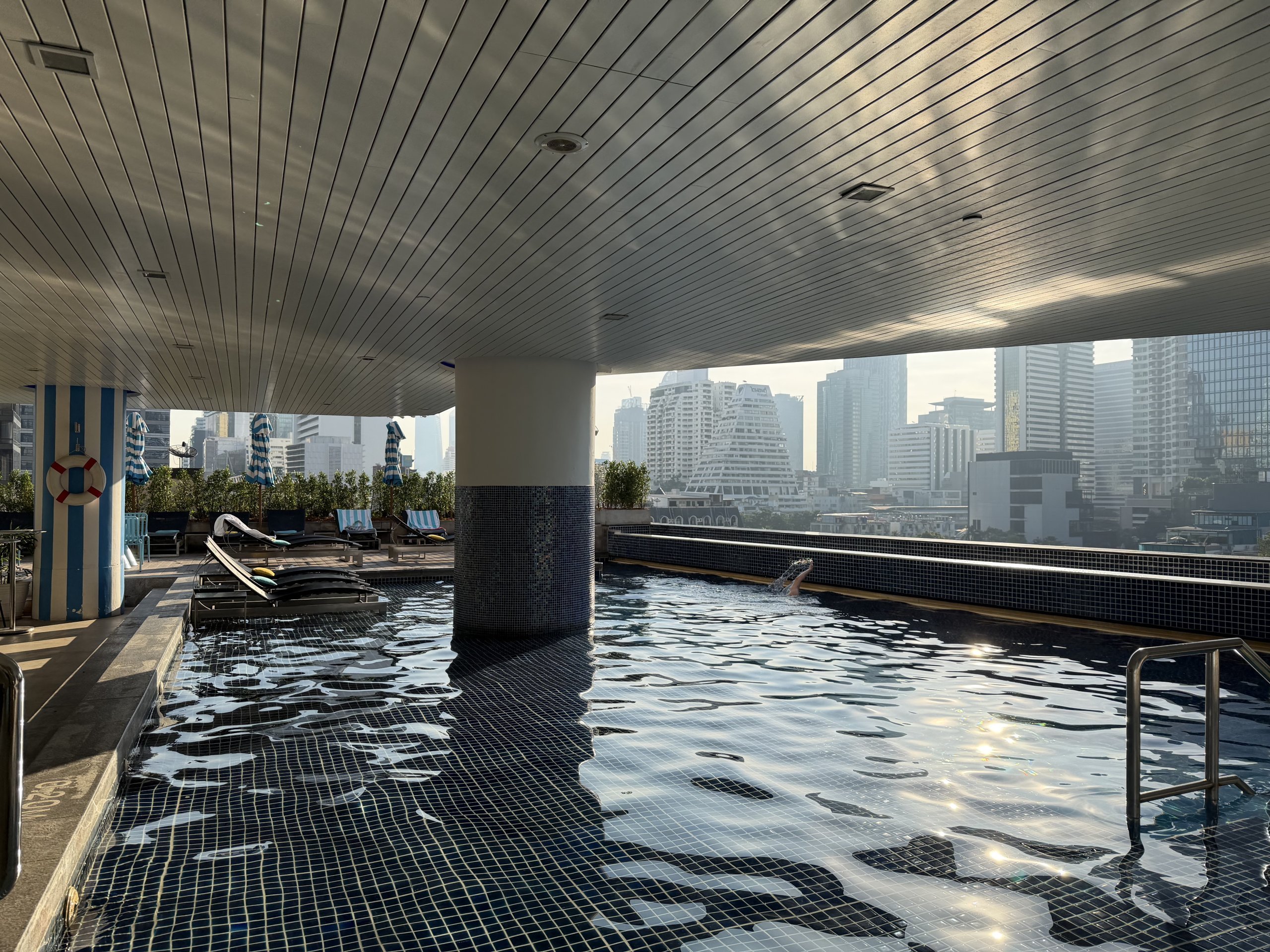 A medence nem rendkívül nagy, de van egy nagy előnye - kilátás a bangkoki felhőkarcolóra, beleértve a 2. legmagasabb felhőkarcolót , King Power Mahanknhon.