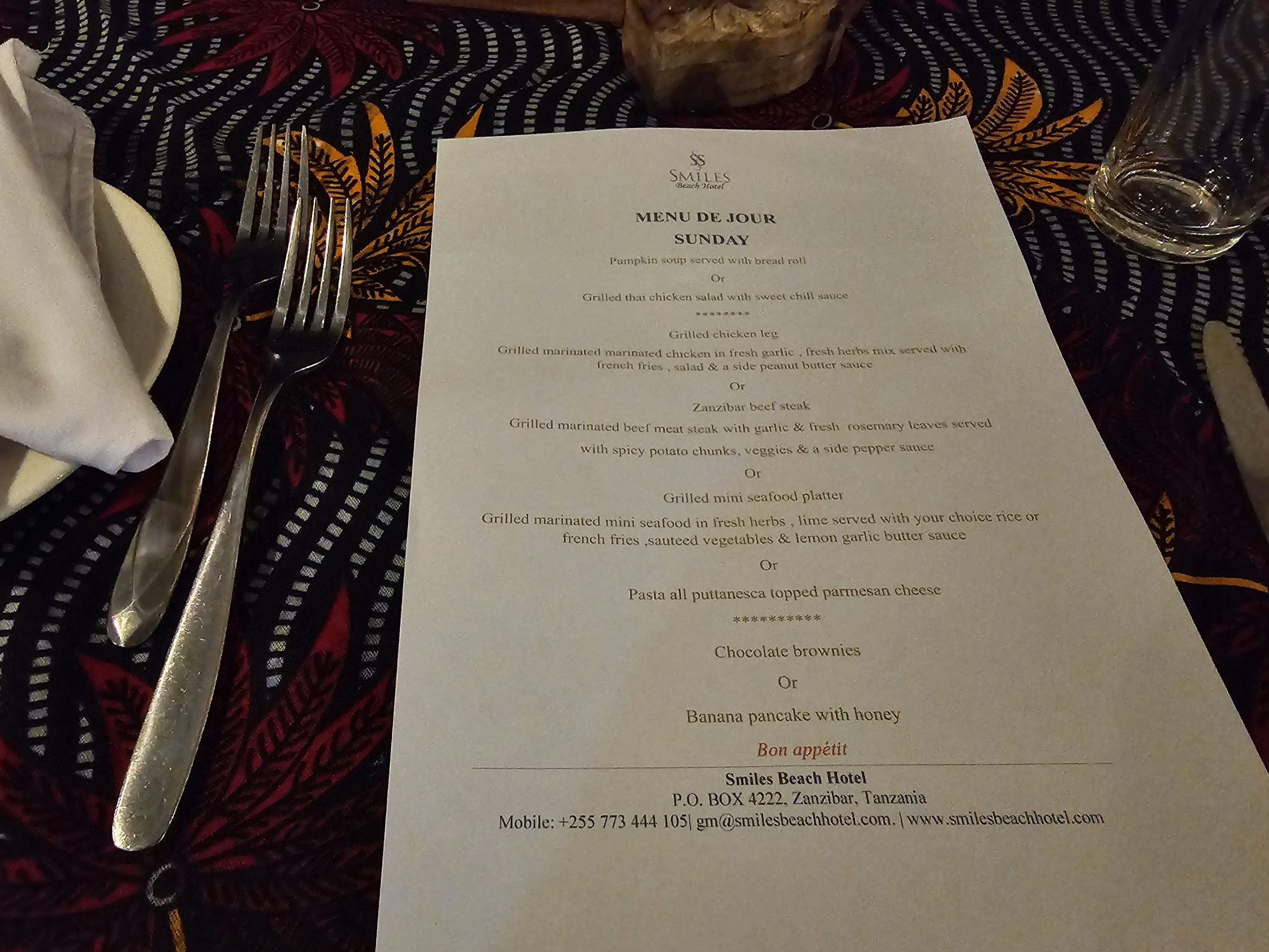 Első ránézésre az étlap nagyon szegényes, de összehasonlítva más, hasonló kategóriájú zanzibári szállodákkal, mint például a Sea View Lodge Jambianiban, ahová Nungwiból költöztem, valójában átlagon felüli.