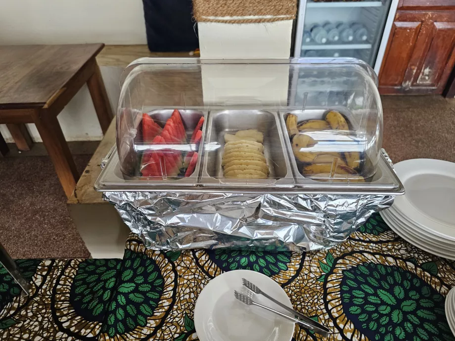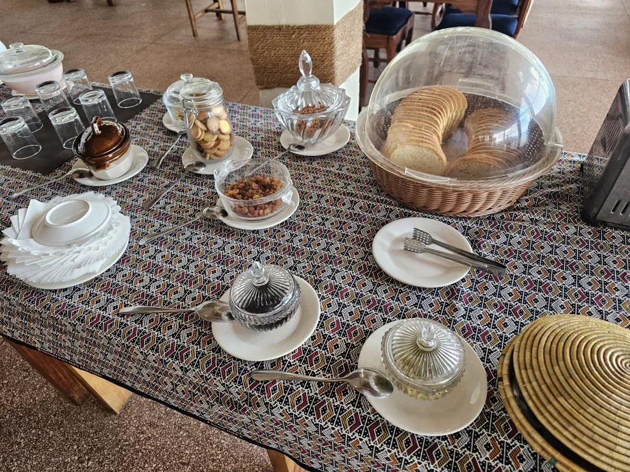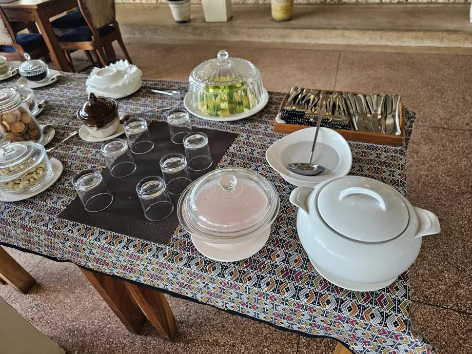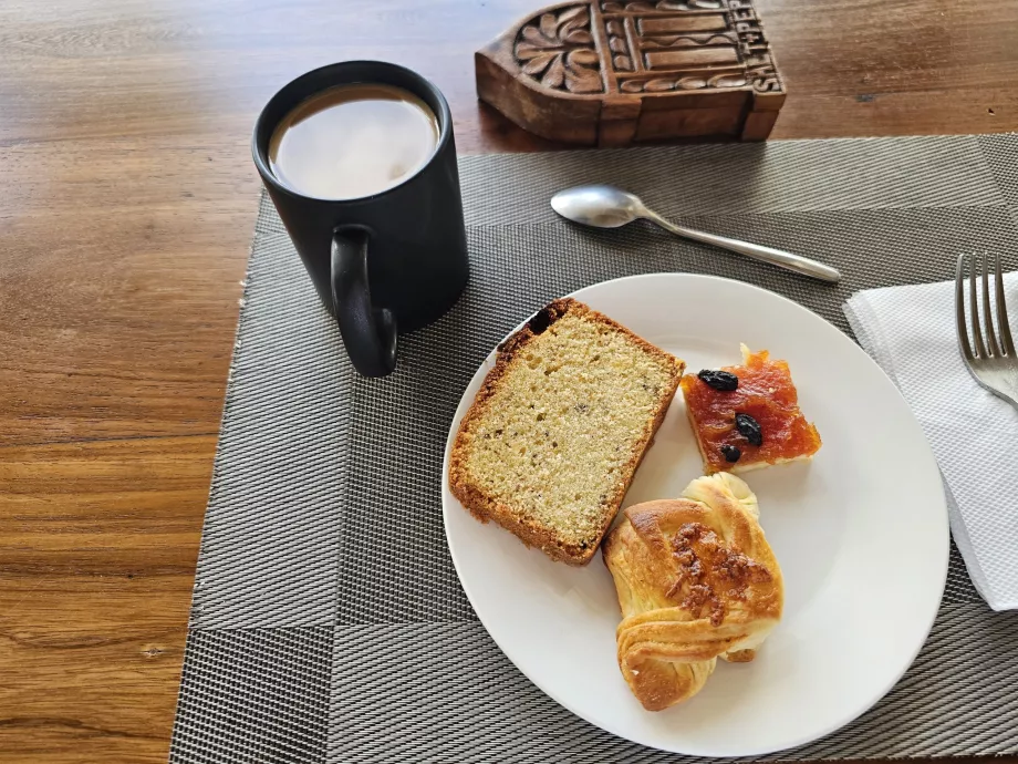 Az egyéb kínálatban joghurt, két-háromféle gyümölcs, édes sütemények, pirított kenyér és mindig kétféle gyümölcslé + víz szerepel.