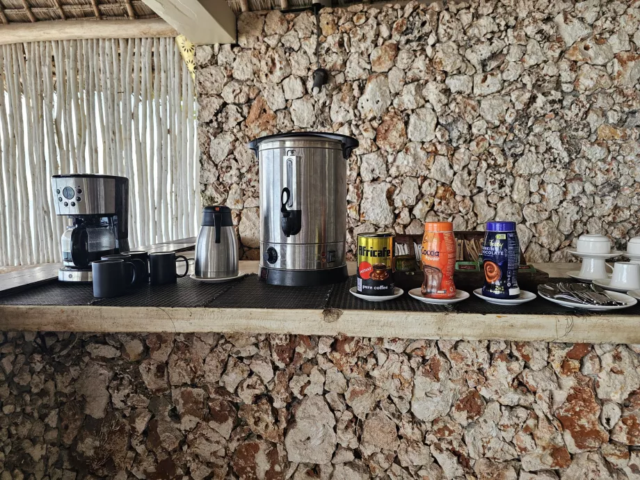 Szűretlen csepegtetett kávé és zacskós teák is kaphatók.
